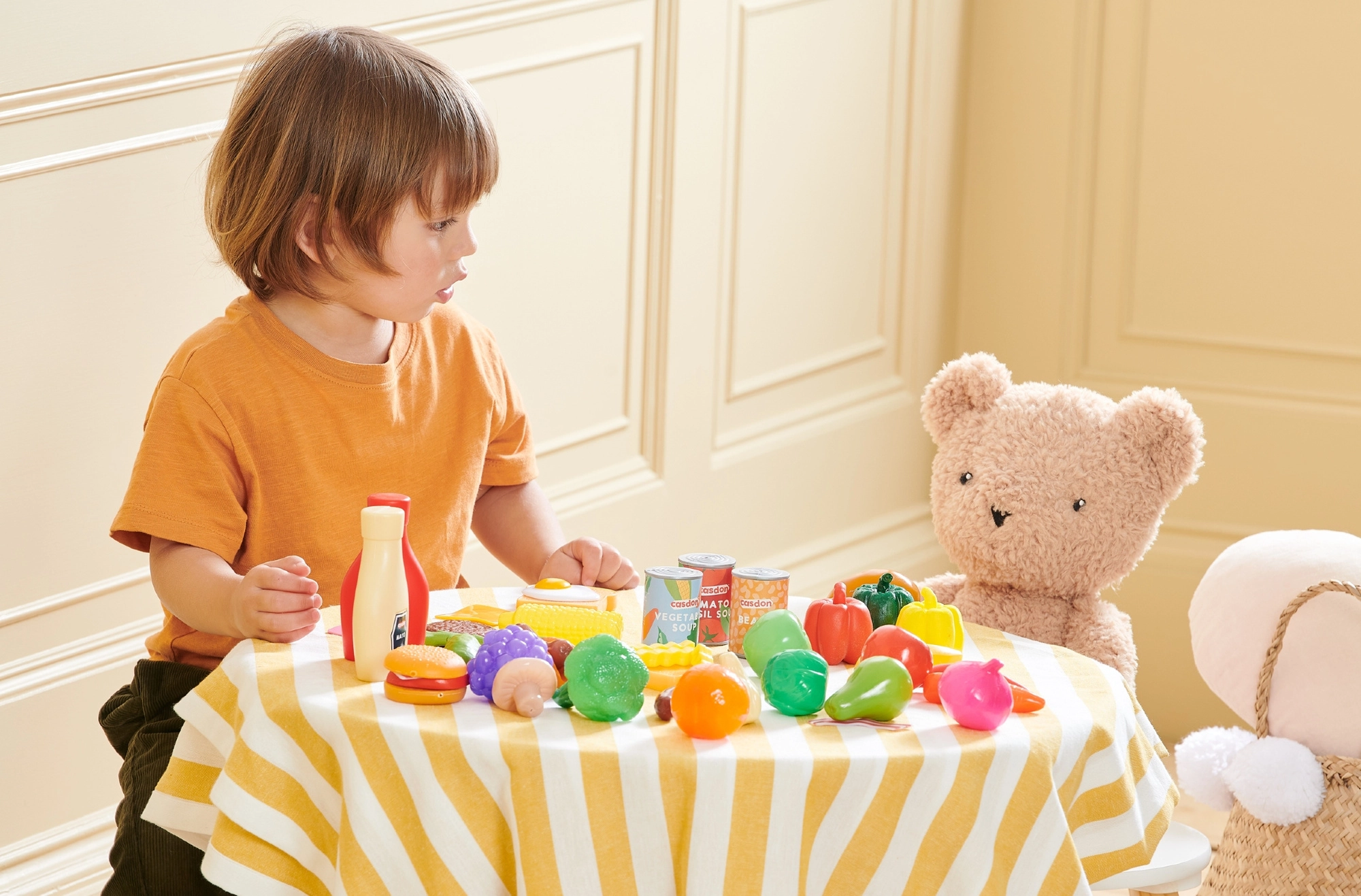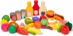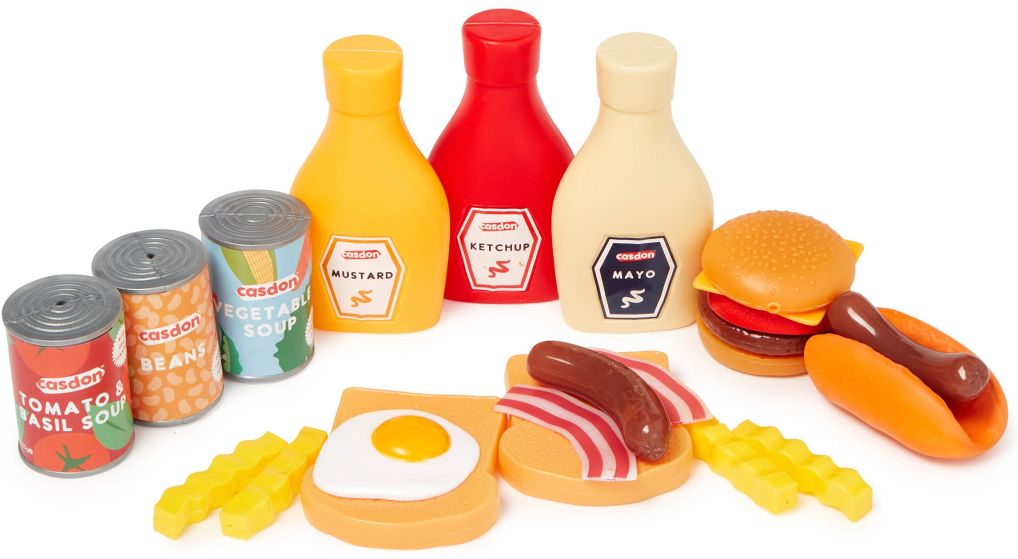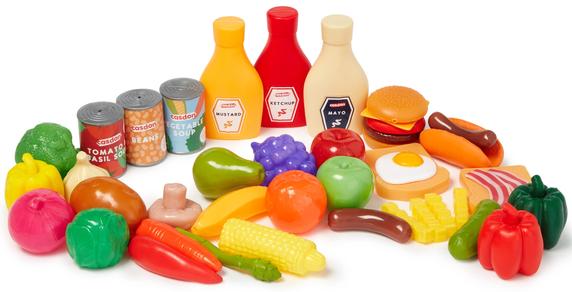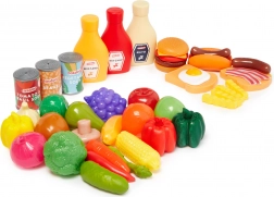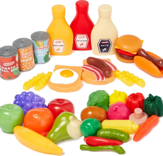 Questo ricco set di alimenti per bambini CASDON offre tutto ciò di cui i piccoli hanno bisogno per un gioco realistico di cucina e spesa. Include frutta e verdura in plastica (banana, mela, cetriolo, uva, cipolla, peperone, pomodoro, broccolo), imitazioni di prodotti confezionati (scatolette, ketchup, senape, maionese) e golose specialità come hamburger, hot dog, patatine fritte o toast con uovo e pancetta.