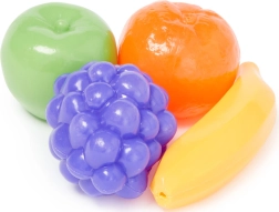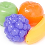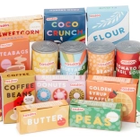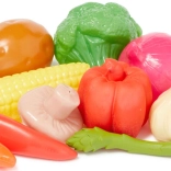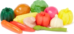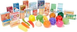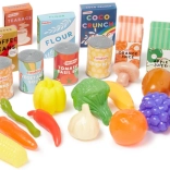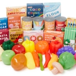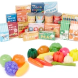 Frutta e verdura in plastica, arricchite da scatoline e lattine in miniatura, sembrano vere. I bambini riconosceranno facilmente banana, uva, mais, peperone o champignon e impareranno i nomi degli alimenti comuni.