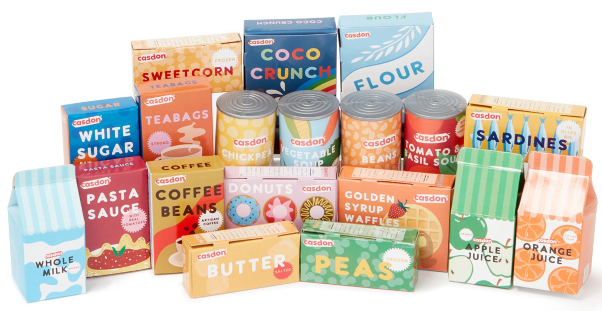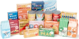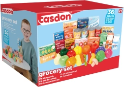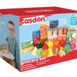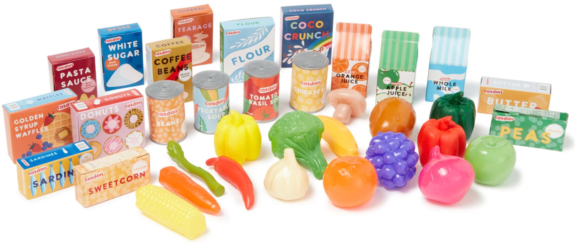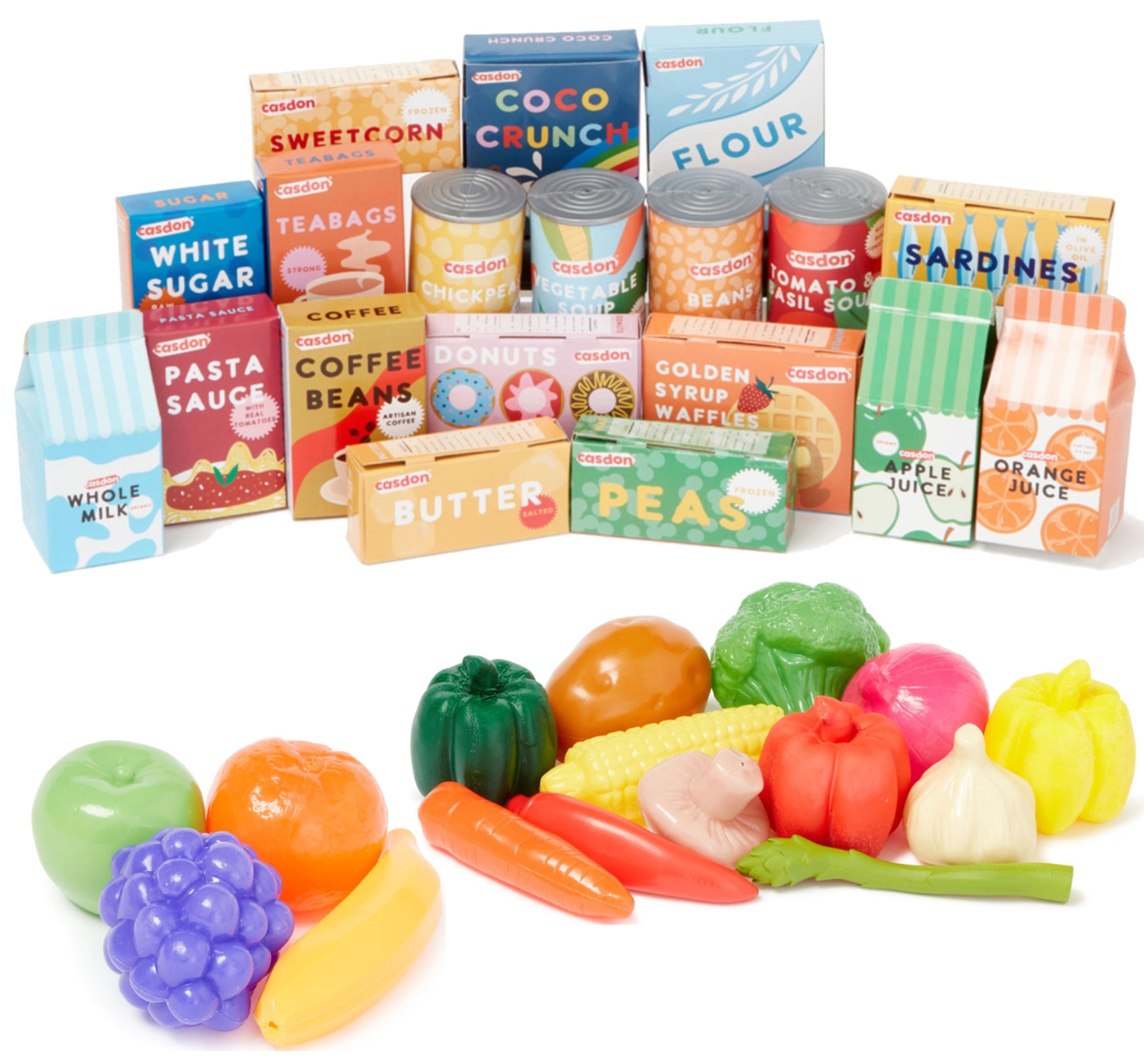 Con questo set riccamente accessoriato, i bambini si divertiranno per ore con il gioco di fantasia. Include frutta e verdura in plastica (ad es. banana, uva, mais, peperone, cipolla, aglio e champignon) e mini confezioni di alimenti comuni (farina, zucchero, caffè, latte, piselli, fagioli, sardine), oltre a bevande e zuppe. Le forme, i colori e le stampe realistiche favoriscono l’apprendimento attraverso il gioco.