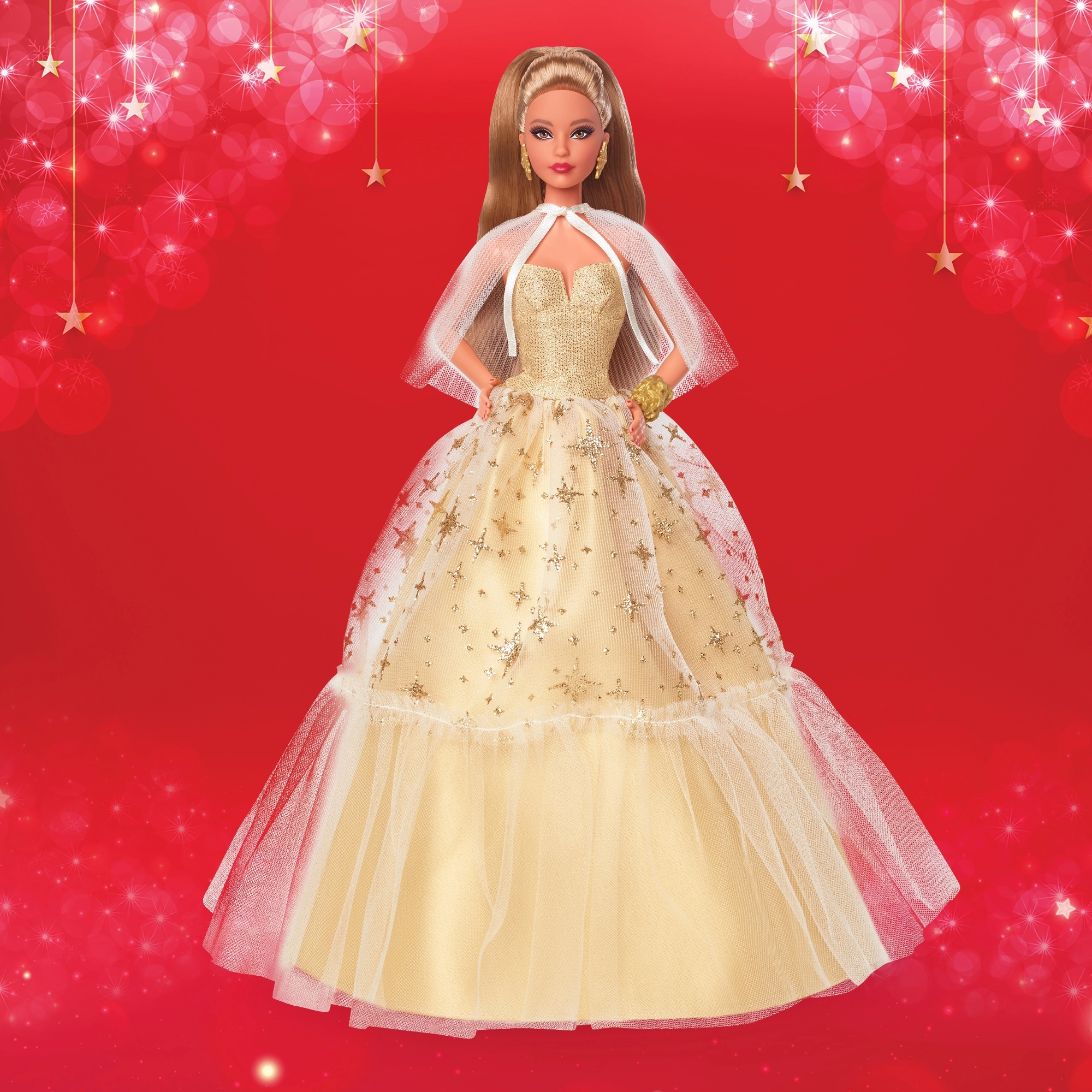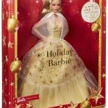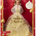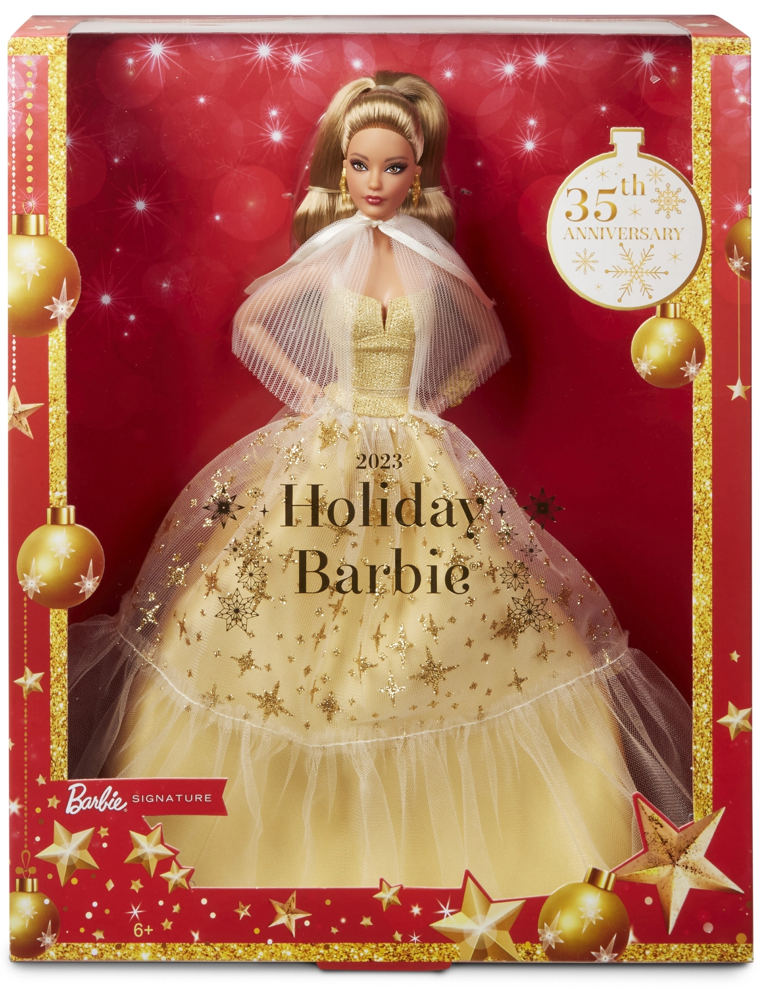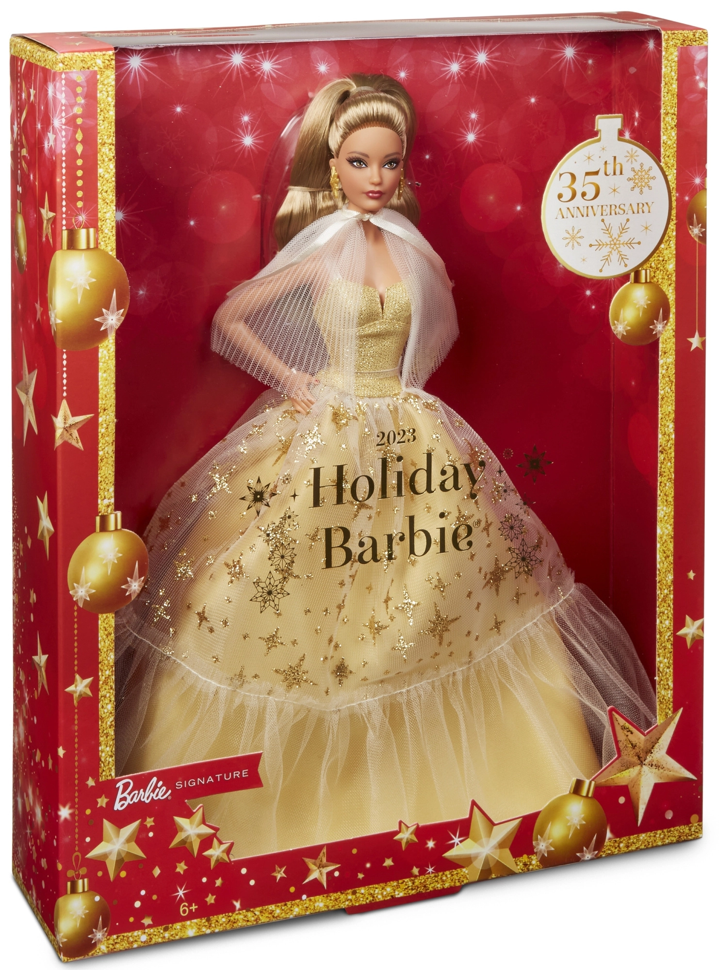 Questa edizione da collezione d’eccezione celebra i 35 anni della iconica linea Barbie. La bambola colpisce per l’aspetto sofisticato: capelli biondo leggermente più scuro, occhi castano chiaro e un’espressione che ne sottolinea il carattere maturo. Eleganti orecchini dorati e unghie rosse completano lo stile festivo.