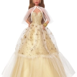 Elegante bambola da collezione BARBIE per il 35º anniversario, in abito satinato color champagne con gonna in tulle costellata di stelle dorate. Completa il look una mantella plissettata semitrasparente, gioielli dorati e dettagli impeccabili di trucco e manicure. Un regalo di Natale ideale e un gioiello per ogni collezione.