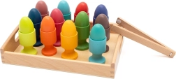 Le pinze in legno incoraggiano i bambini a una presa precisa e al trasferimento delle uova nei bicchierini, rafforzando le dita e la coordinazione occhio–mano.