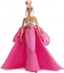 Scopri l'eleganza a prima vista: un abito da sera rosa abbagliante con ricco strascico, corsetto impreziosito da pietre in tono dorato e styling moderno con occhiali rosa donano alla bambola un look iconico. Make-up preciso, accessori curati e la possibilità di posizionamento esaltano ogni dettaglio di stile.