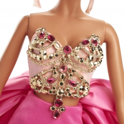 Un corpetto dorato riccamente decorato con cristalli rosa e catenelle conferisce alla bambola un look esclusivo, perfetto per la vetrina.