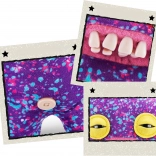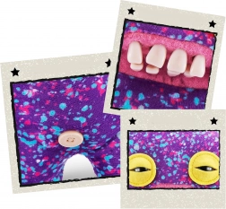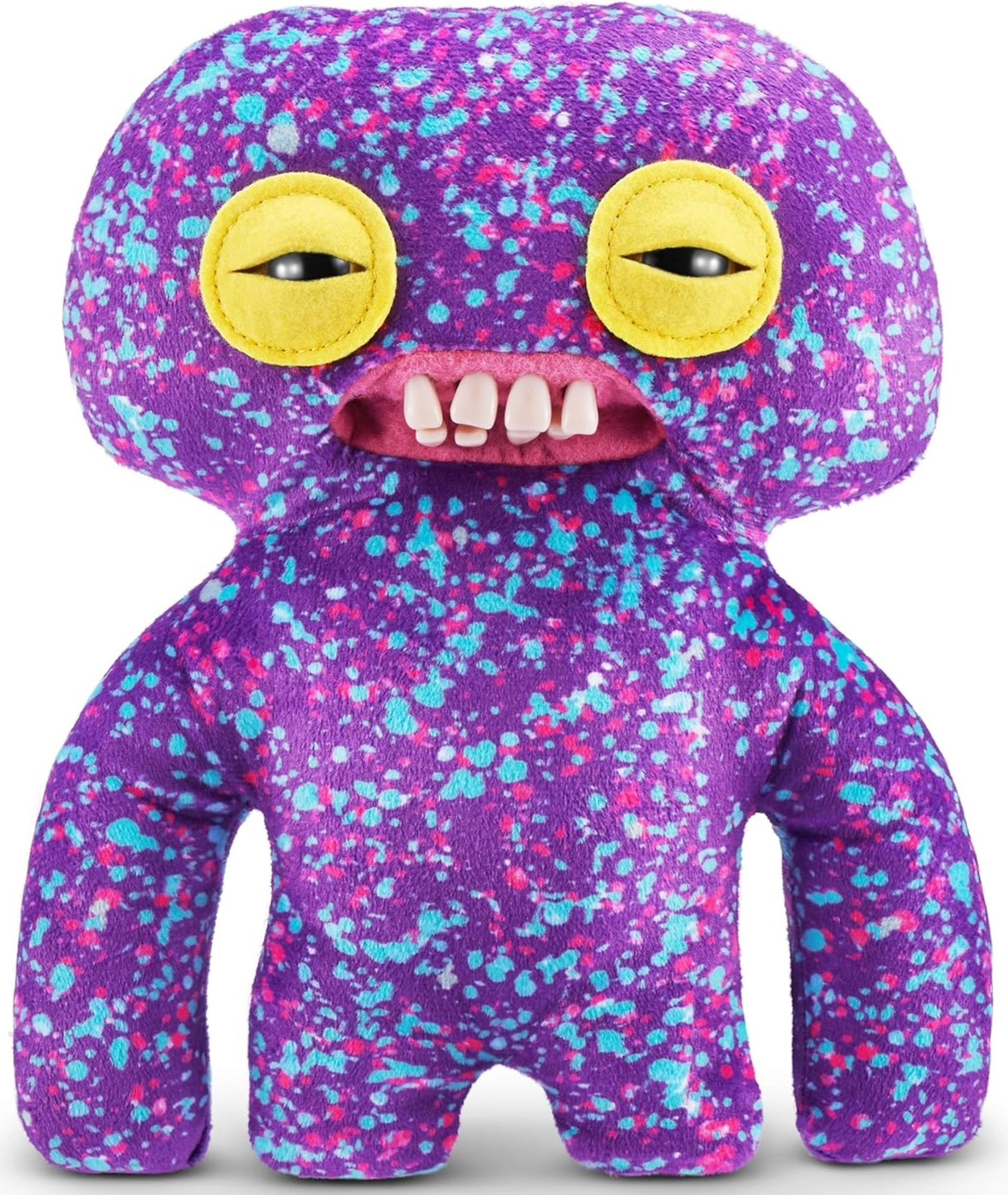 Il peluche FUGGLER Squidge del marchio Spin Master colpisce a prima vista per il suo aspetto insolito. Il corpo viola è decorato da macchie a contrasto in tonalità blu e rosa, che creano un effetto artistico, quasi astratto. Il protagonista è la dentatura comicamente spaventosa, il ghigno, che dona al giocattolo un fascino e un umorismo unici.
