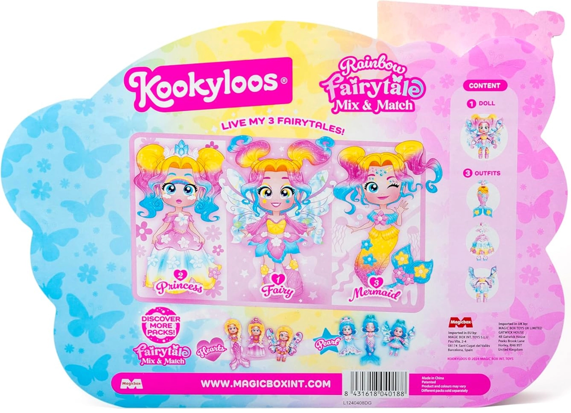 Nella confezione trovi abito da principessa con dettagli scintillanti, ali e gonnellina da fata per avventure magiche e coda da sirena con effetto arcobaleno per storie sottomarine. Gli abiti e gli accessori possono essere combinati e scambiati anche con altre figurine KookyLoos.