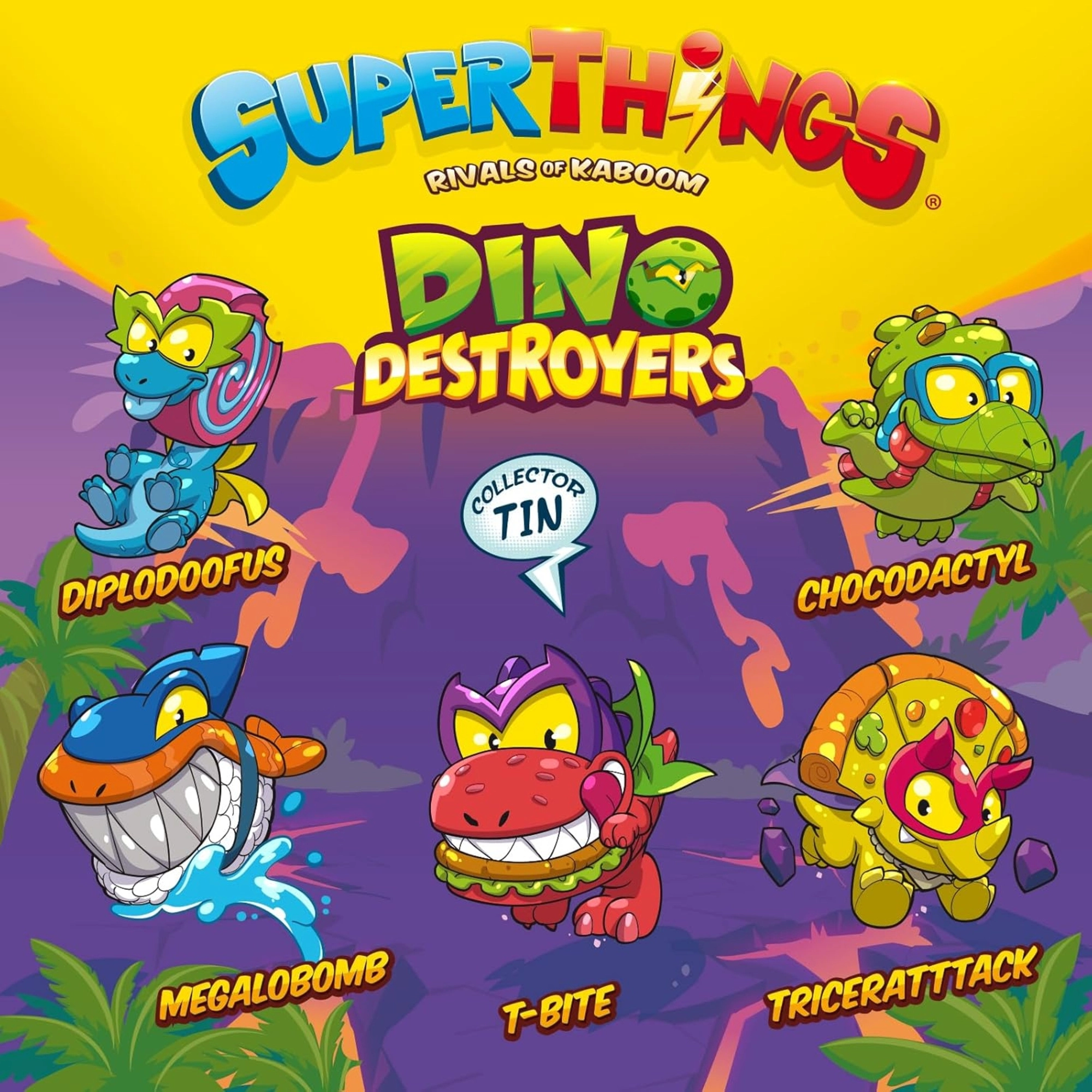 Scopri la sensazione da collezione SuperThings Dino Destroyers in un’elegante lattina argentata. All’interno troverai 5 figure esclusive, introvabili altrove, e un confezionamento metallico sicuro, ideale per custodire la tua collezione. Il set combina motivi preistorici di dinosauri con il cibo e offre divertimento, esposizione e valore da collezione per i fan di Kaboom City.