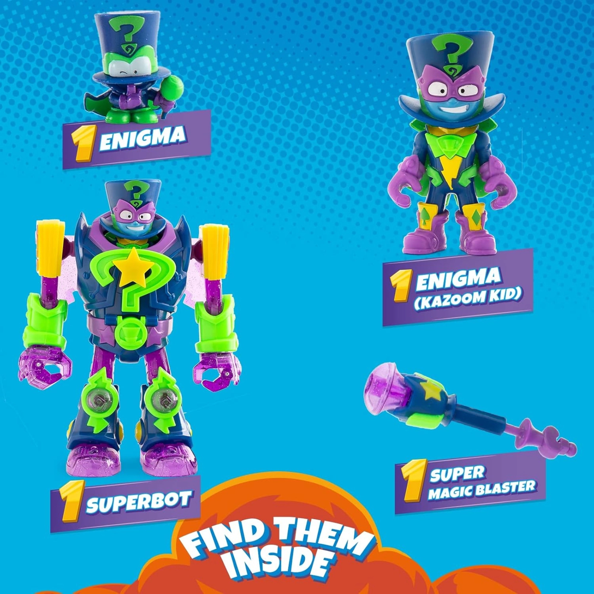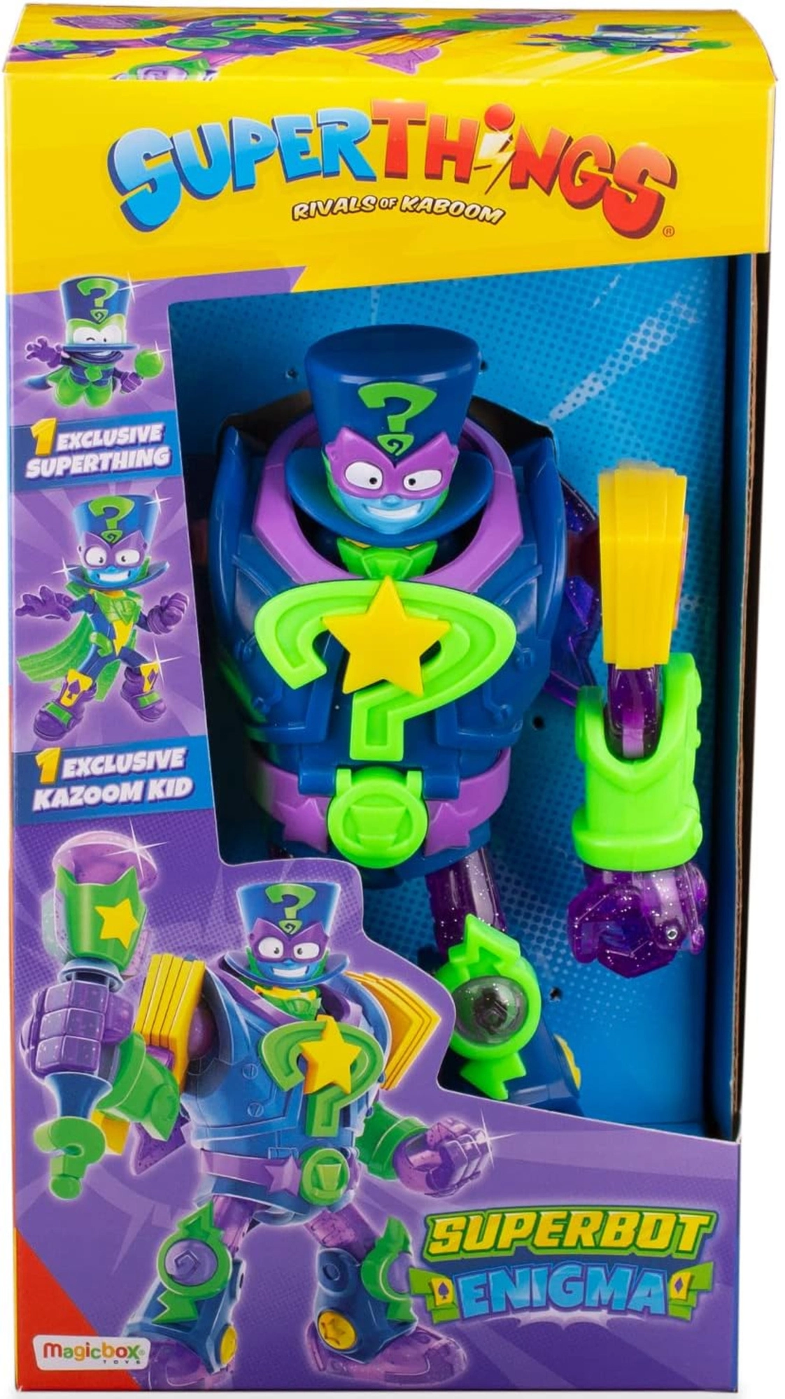 Scopri SUPERTHINGS Enigma Superbot – un impressionante robot-cattivo con arti articolati, ali apribili e un ricco set di accessori. Nella confezione trovi un Kazoom Kid esclusivo, una minifigure SuperThing e un arma Kazoom per battaglie d’azione a Kaboom City. Un’ottima scelta per i bambini che amano storie creative e un gioco dinamico.