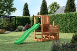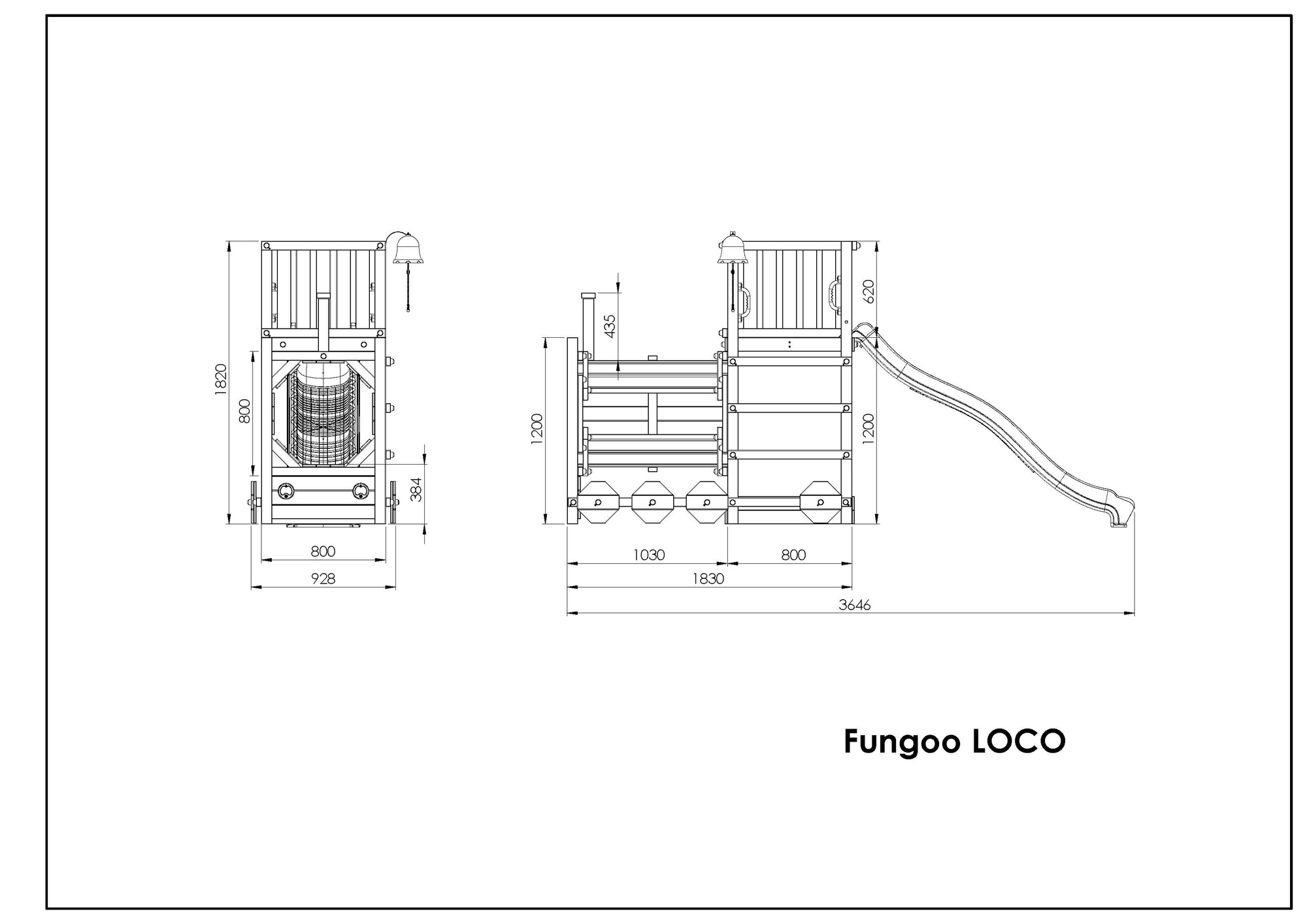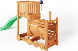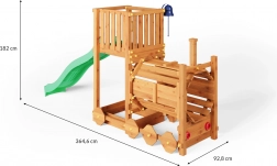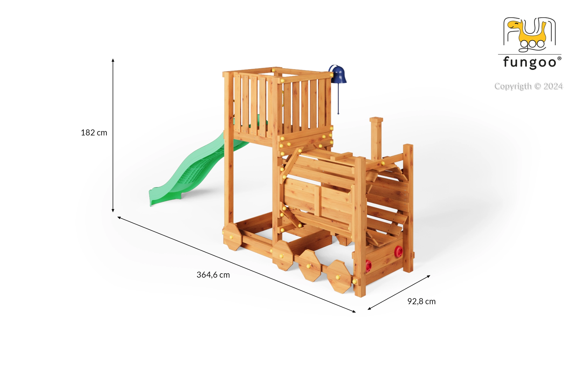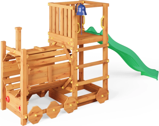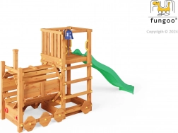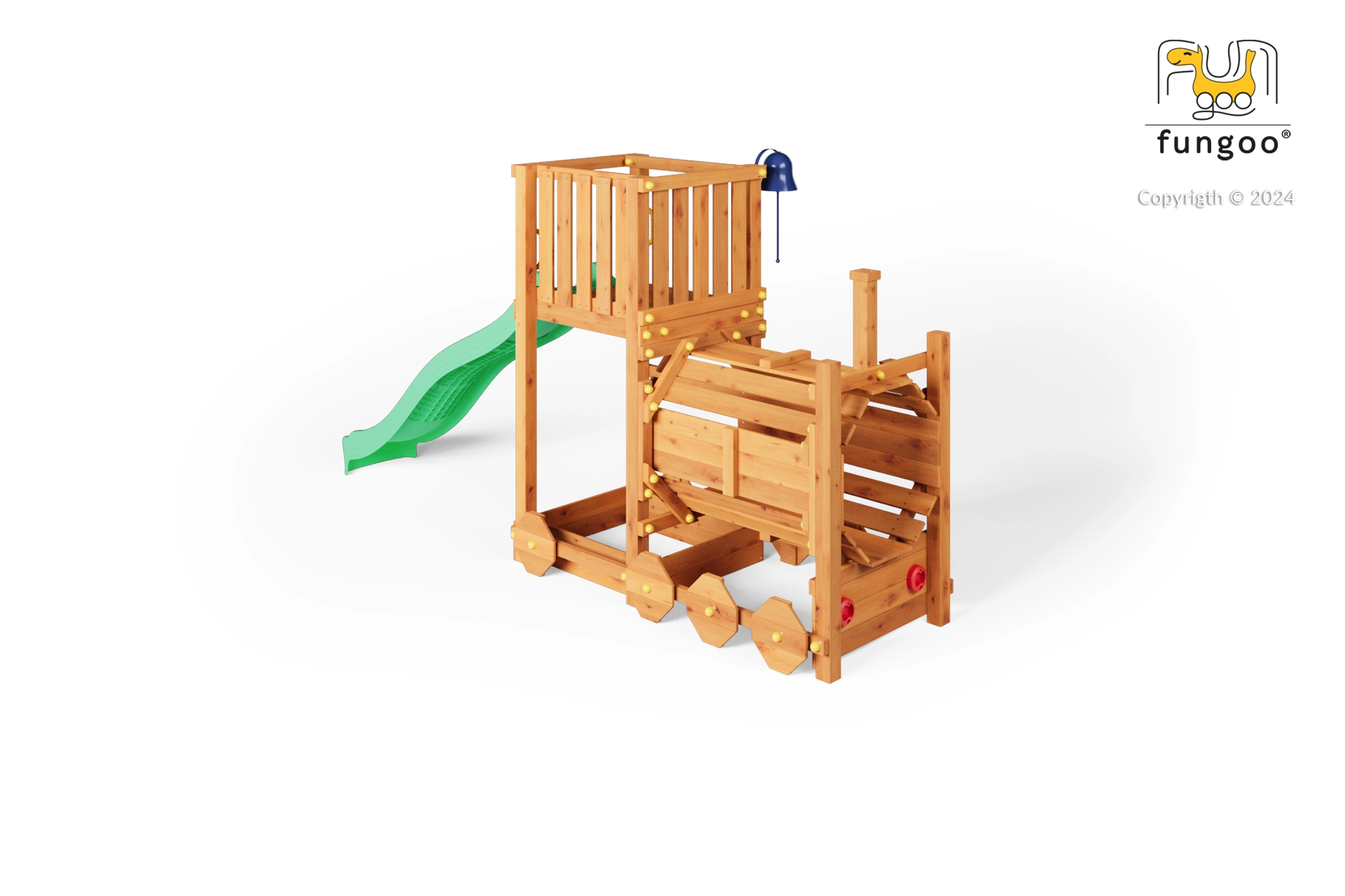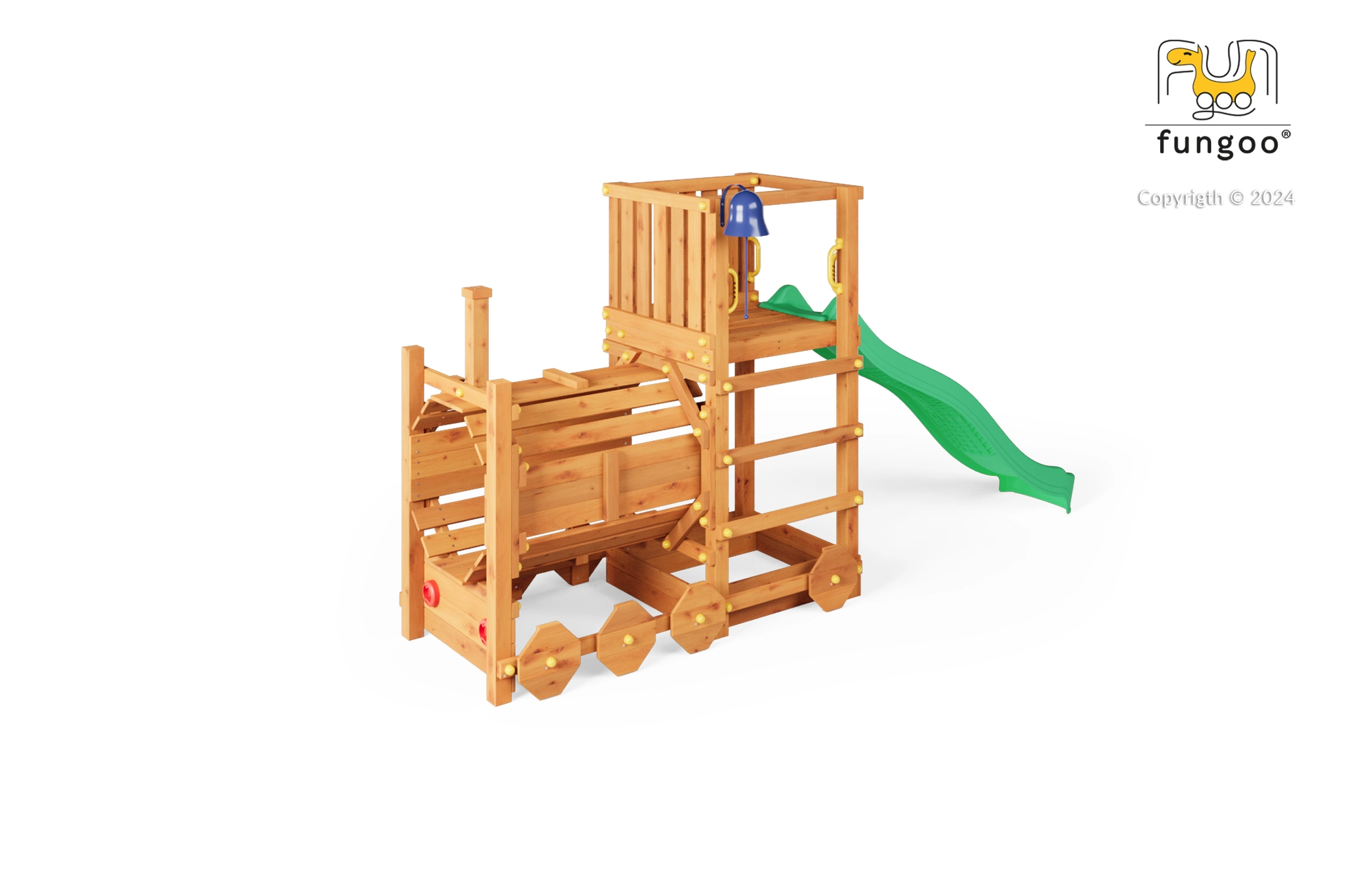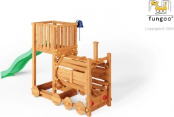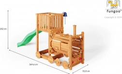 Il parco FUNGOO Loco è progettato come una locomotiva con tunnel, che invita ad arrampicarsi, nascondersi e al gioco di ruolo da macchinista. Il lungo scivolo ondulato da 2,2 m assicura tante discese divertenti, mentre la campanella stimola l’immaginazione e il gioco interattivo. La struttura in legno di qualità impregnato è resistente alle intemperie e saldamente ancorata al suolo.