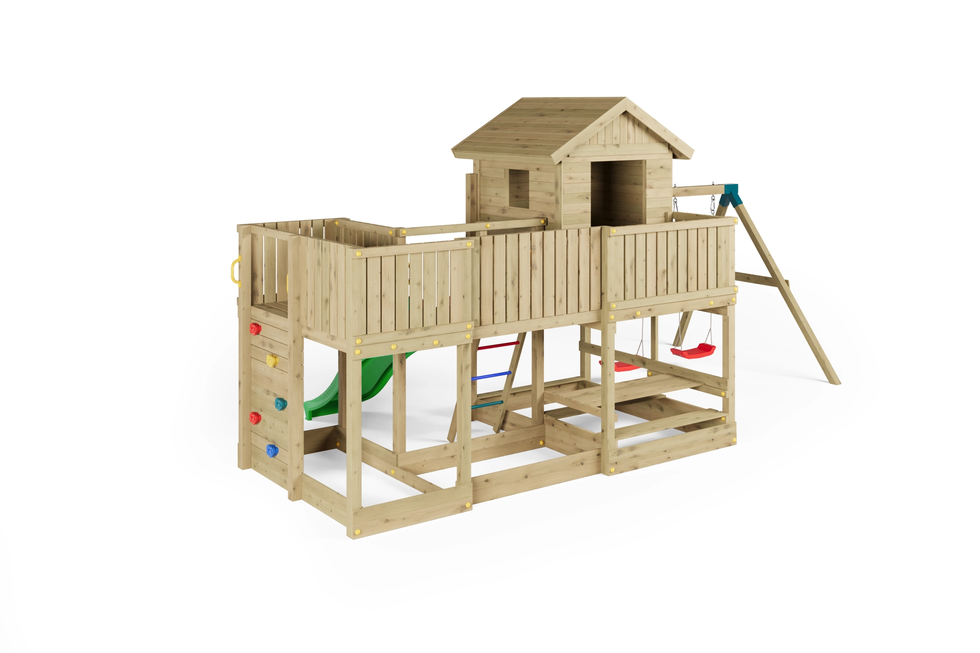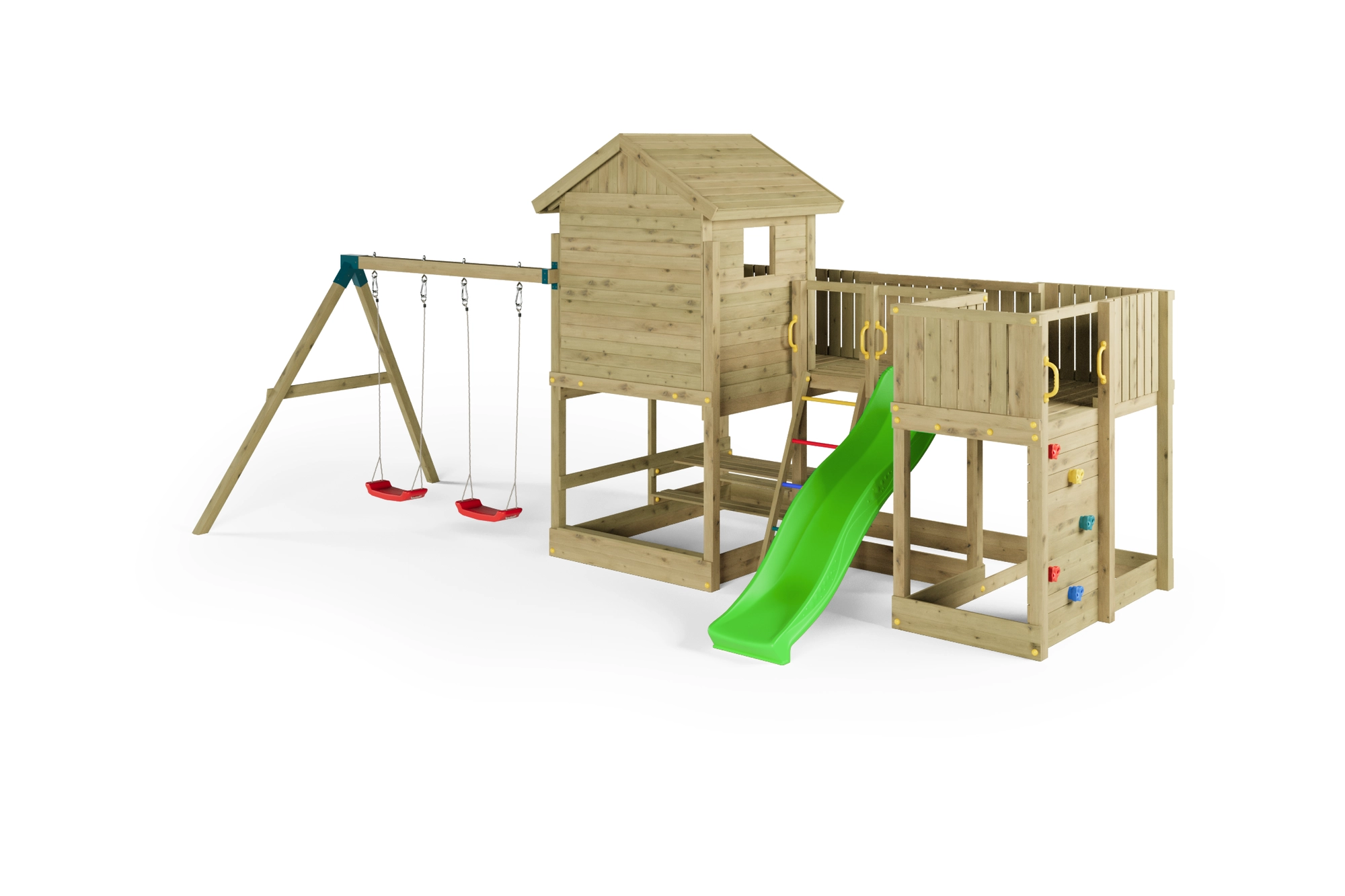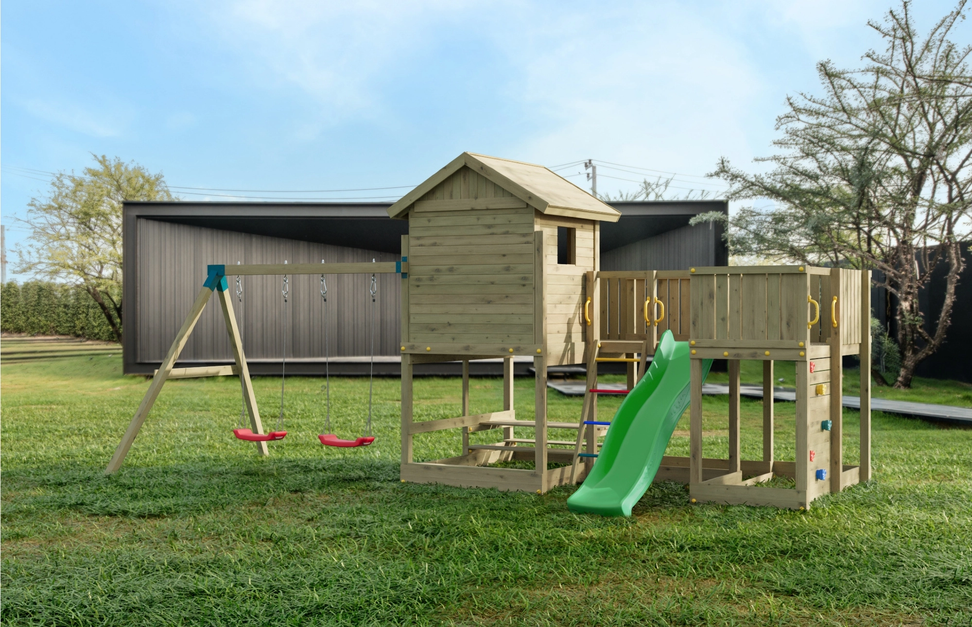 Fungoo Longstepper è un parco giochi da giardino completo, realizzato in legno di qualità impregnato a pressione, progettato per una lunga durata e per il divertimento quotidiano. Grazie alla disposizione studiata degli elementi, sviluppa motricità, equilibrio e immaginazione dei bambini. La sicurezza è aumentata da maniglie, corrimano e robuste giunzioni metalliche.