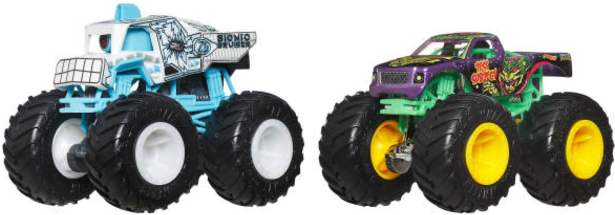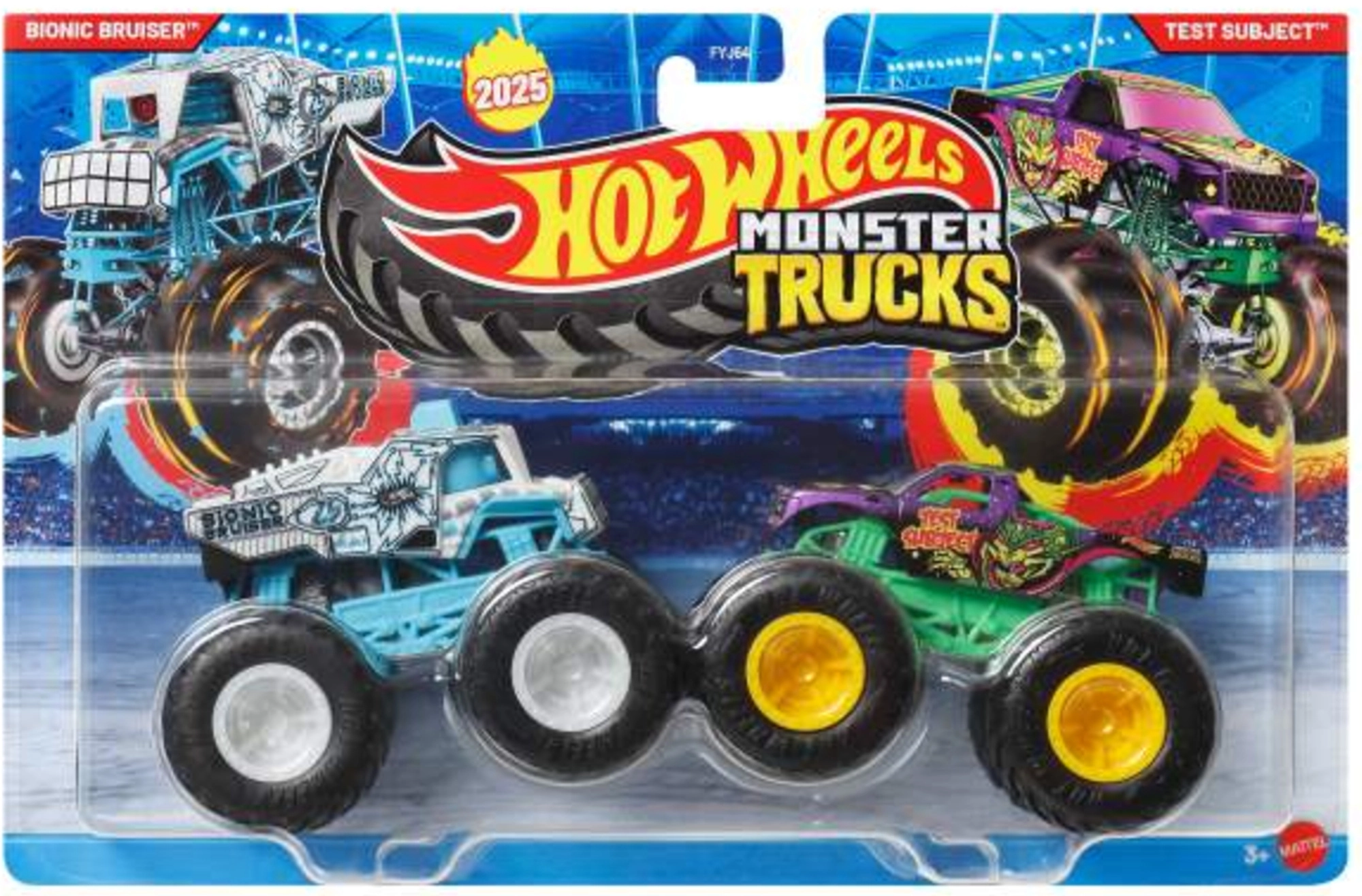 Questo set di due monster truck della collezione Hot Wheels farà felice ogni piccolo pilota. Il modello Bionic Bruiser colpisce con la sua livrea bianco-blu con elementi colorati, mentre Test Subject sorprende con la verniciatura verde-viola e grafiche accattivanti. Entrambi i veicoli hanno una struttura solida e resistente, in grado di affrontare urti e corse spericolate.