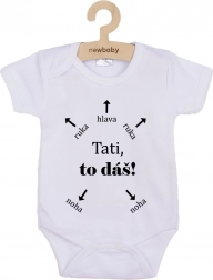 Comodo body per bambini a manica corta con la scritta originale “Papà, ce la farai!” del marchio NEW BABY. Realizzato in 100% cotone morbido e traspirante, delicato sulla pelle sensibile. Pratica chiusura a bottoncini a pressione sulla spalla e tra le gambine per facilitare il cambio e la vestizione. Colori certificati e materiale con OEKO-TEX STANDARD 100 per un uso sicuro anche per i neonati.
