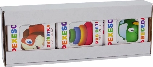 Pexeso è uno dei giochi per bambini più amati, che inoltre aiuta nello sviluppo dei bambini. Questo set include tre diversi pexeso in scatole di latta, focalizzati sull'alfabeto, animali con l'inglese e giochi per bambini.