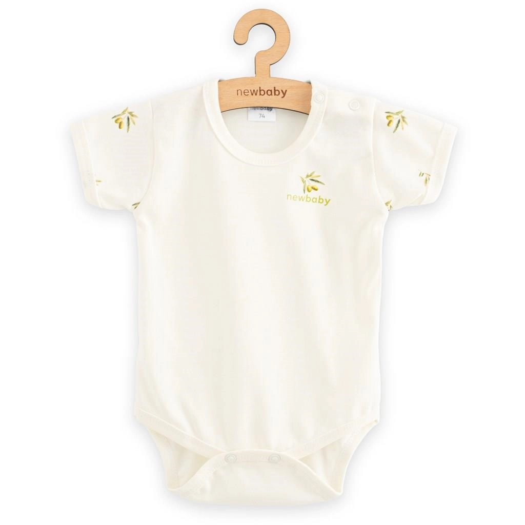 Comodo body per neonato a maniche corte in cotone organico del marchio New Baby, impreziosito da una delicata stampa con olive. La pratica chiusura a bottoncini a pressione sulla spalla e tra le gambine facilita vestizione e cambio. Il materiale è morbido, traspirante e delicato sulla pelle sensibile dei bambini. La certificazione OEKO-TEX STANDARD 100 garantisce l’assenza di sostanze nocive.