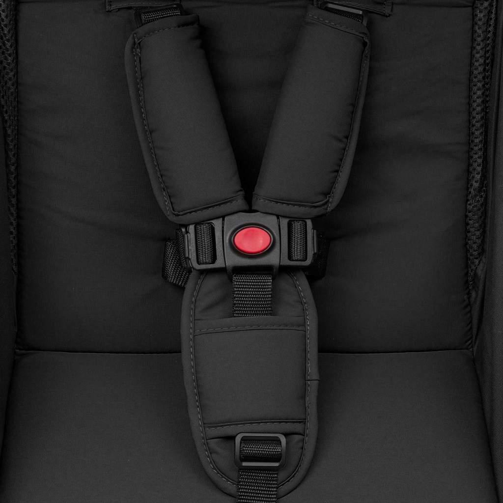 Il comfort è garantito dallo schienale reclinabile dalla posizione seduta al semi‑reclinato, dal poggiapiedi regolabile e dalla barra di protezione removibile. La dotazione include un pratico coprigambe che protegge da freddo e vento. La sicurezza è supportata da blocco automatico anti‑apertura e freno posteriore centralizzato. Il prodotto è conforme alla norma EN 1888.