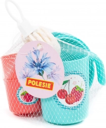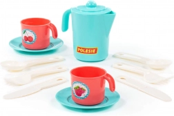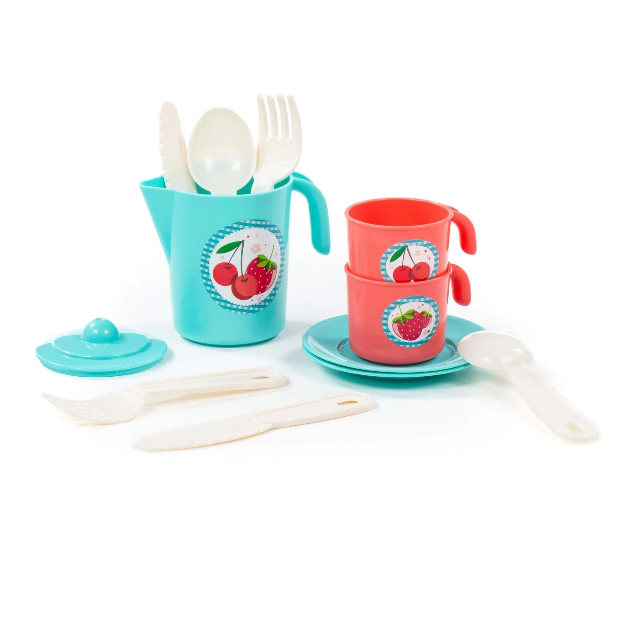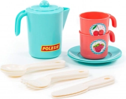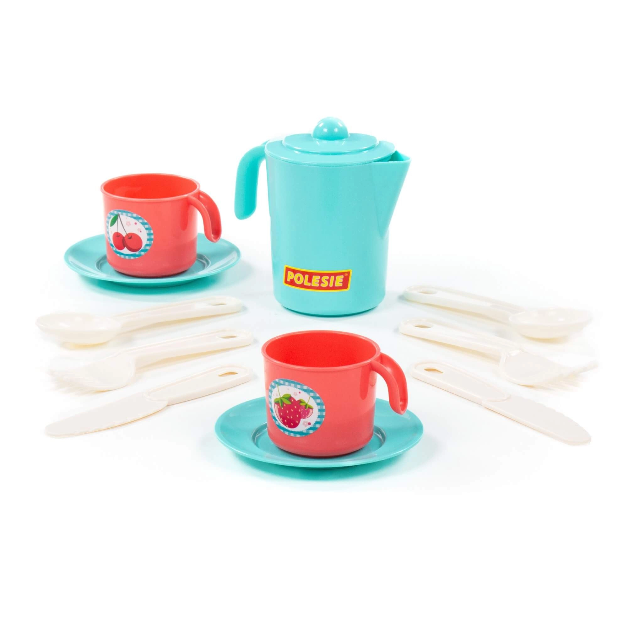 La confezione include una teiera con coperchio, 2 tazzine con manici, piattini/sottotazze e posate in plastica. Grazie ai bordi lisci e sicuri e al basso peso le stoviglie sono facili da maneggiare. Dimensioni compatte ca. 130 × 105 × 121 mm per facilitare riporre e trasportare.