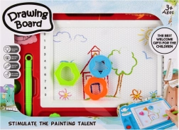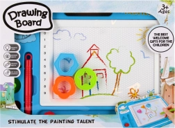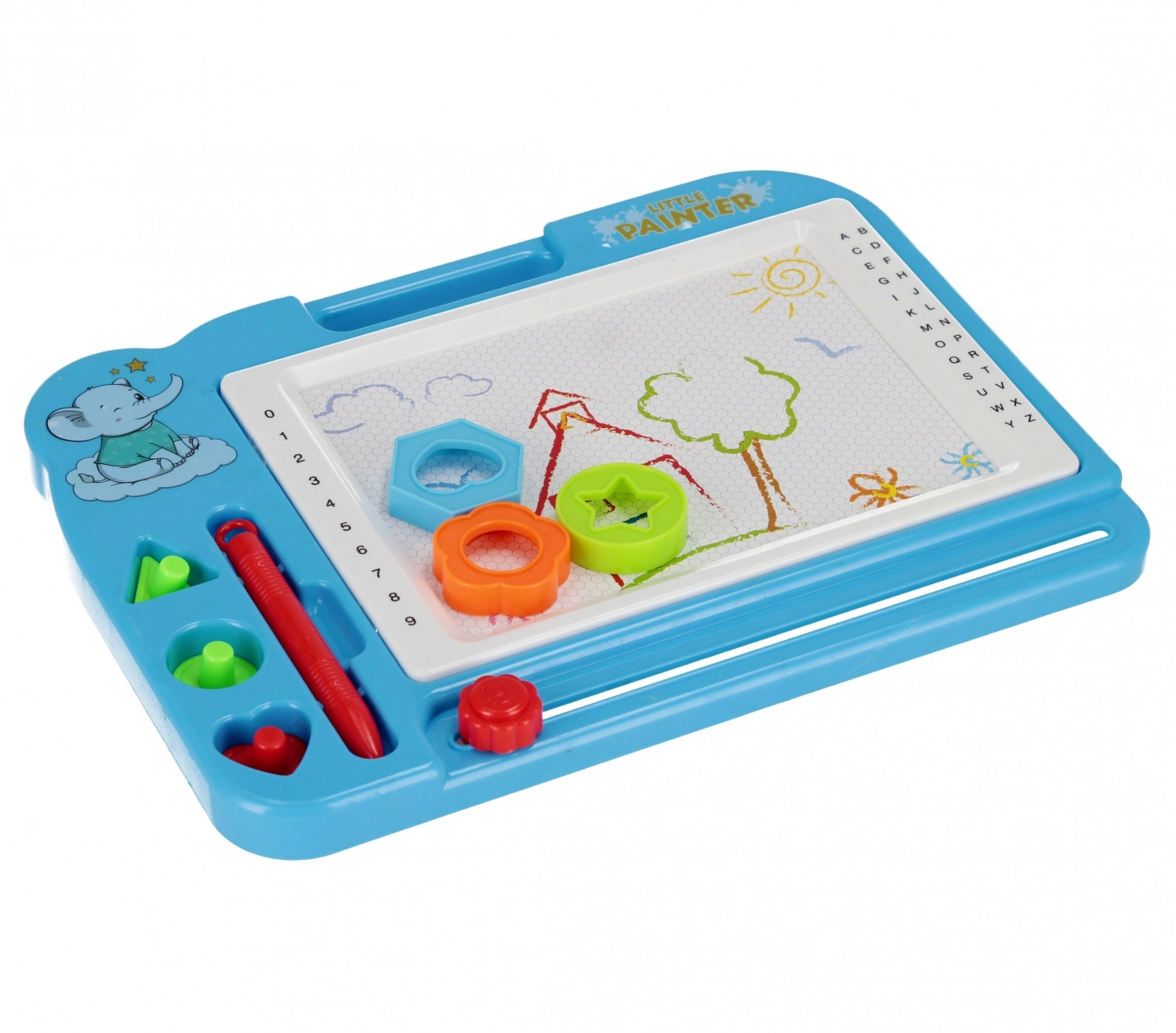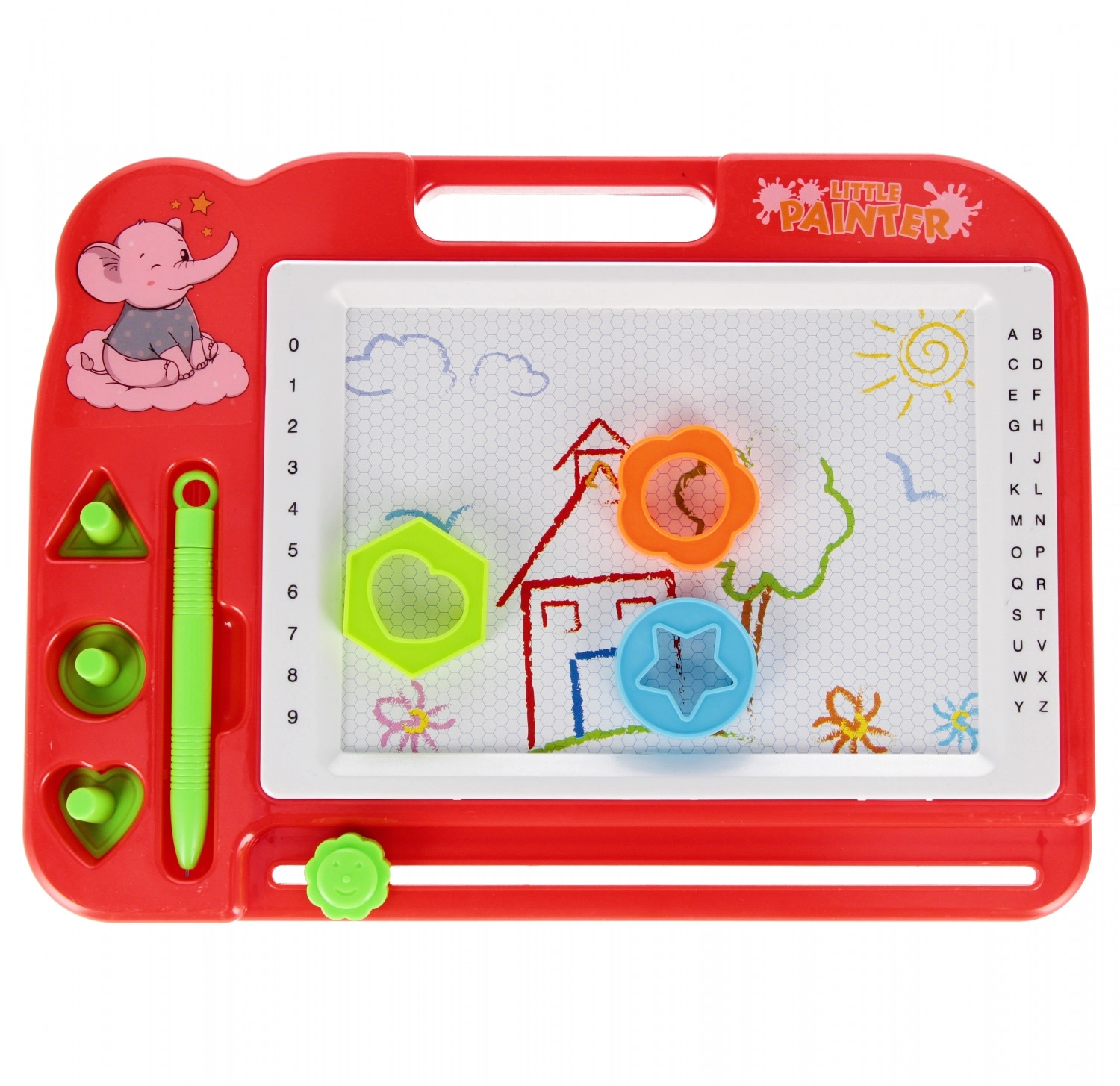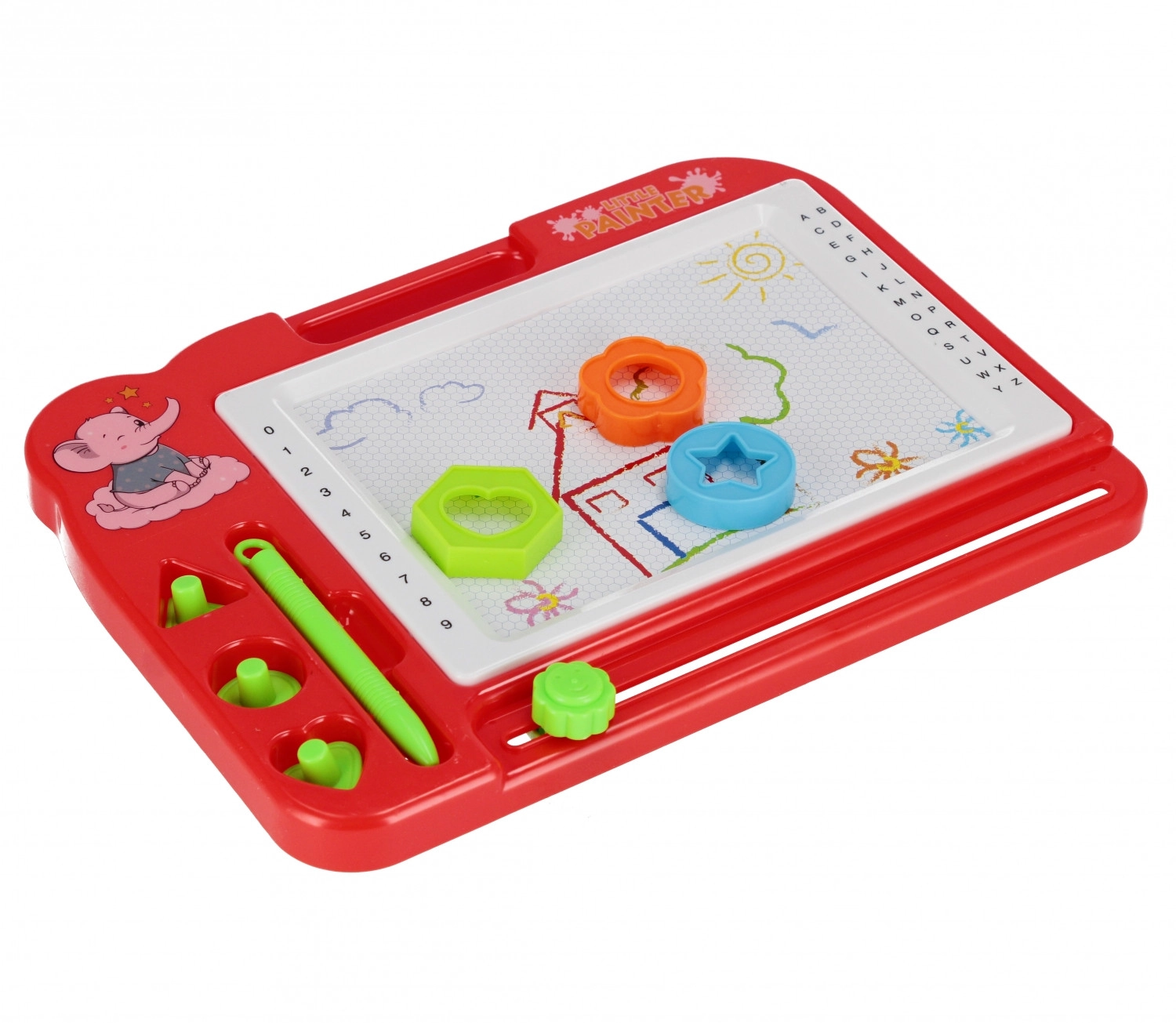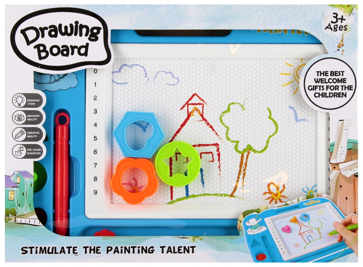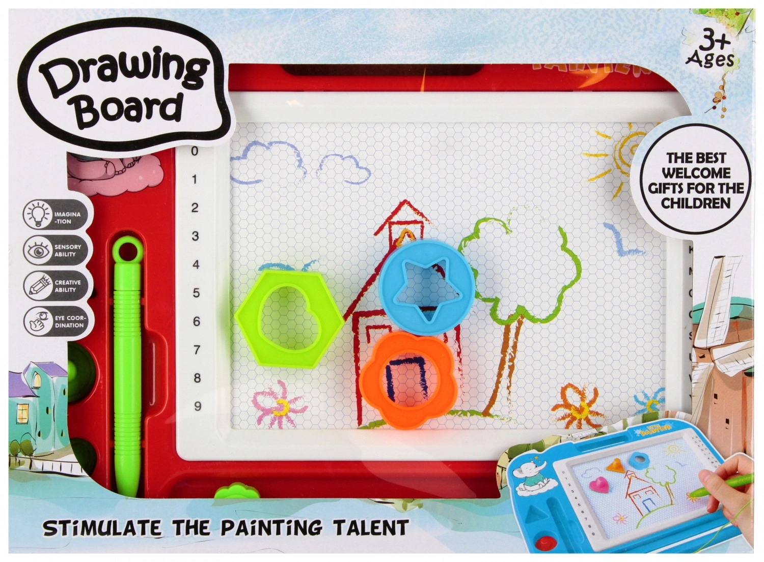 Questa lavagnetta magica offre un modo semplice e pulito per permettere ai bambini di esprimere la loro fantasia. Con lo stilo magnetico e i timbrini sagomati i bambini disegnano sulla superficie bianca e, con un solo gesto della gomma scorrevole, cancellano facilmente tutto. La lavagnetta è leggera, resistente e comoda da tenere grazie alla pratica maniglia.