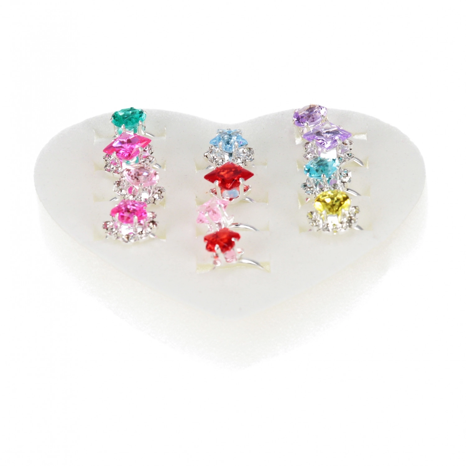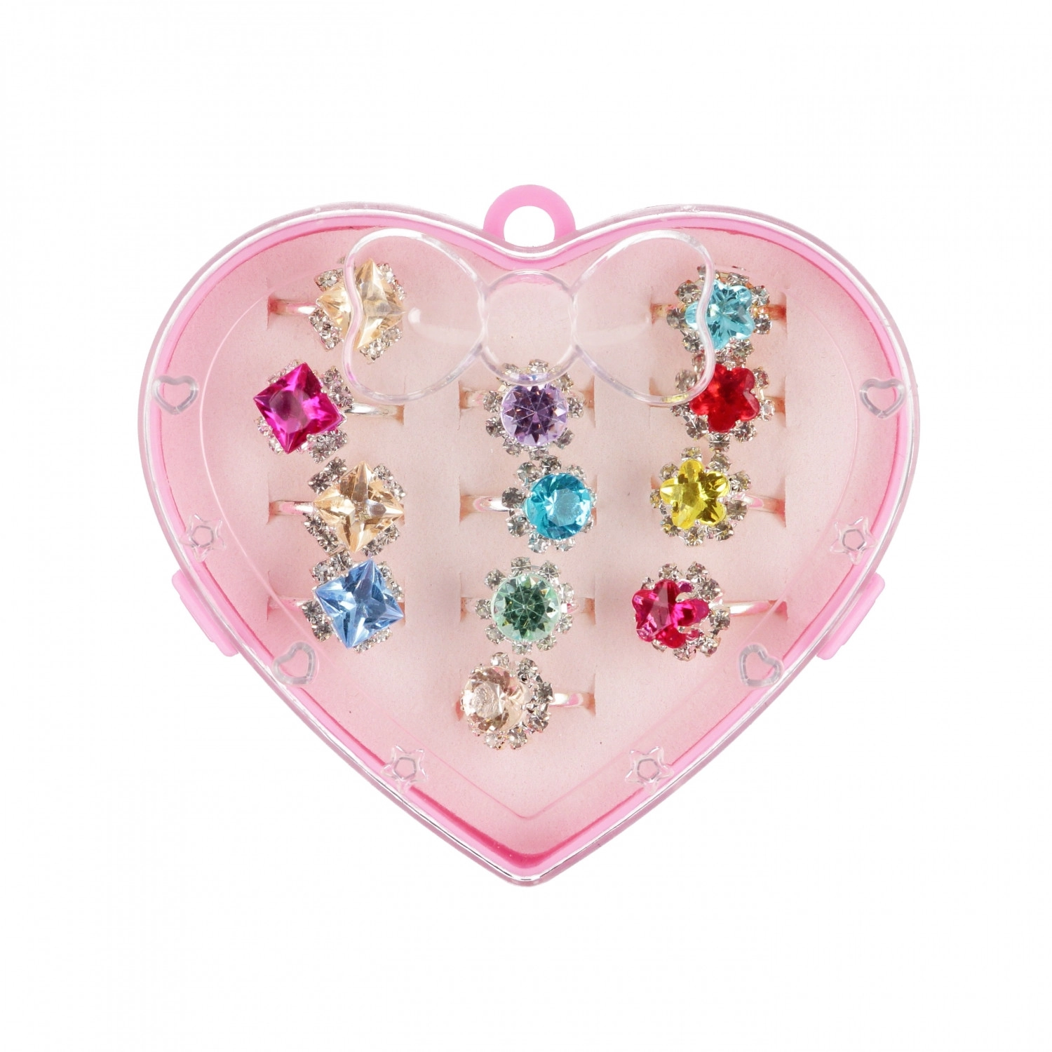 Questo set incantevole offre una ricca selezione di anellini con pietrine lucenti e forme creative che i bambini adorano. Ogni scatolina contiene 12 pezzi, così i piccoli possono abbinare facilmente l’accessorio al loro outfit o costume preferito. La scatolina funge anche da pratica custodia e protezione per gli anellini.