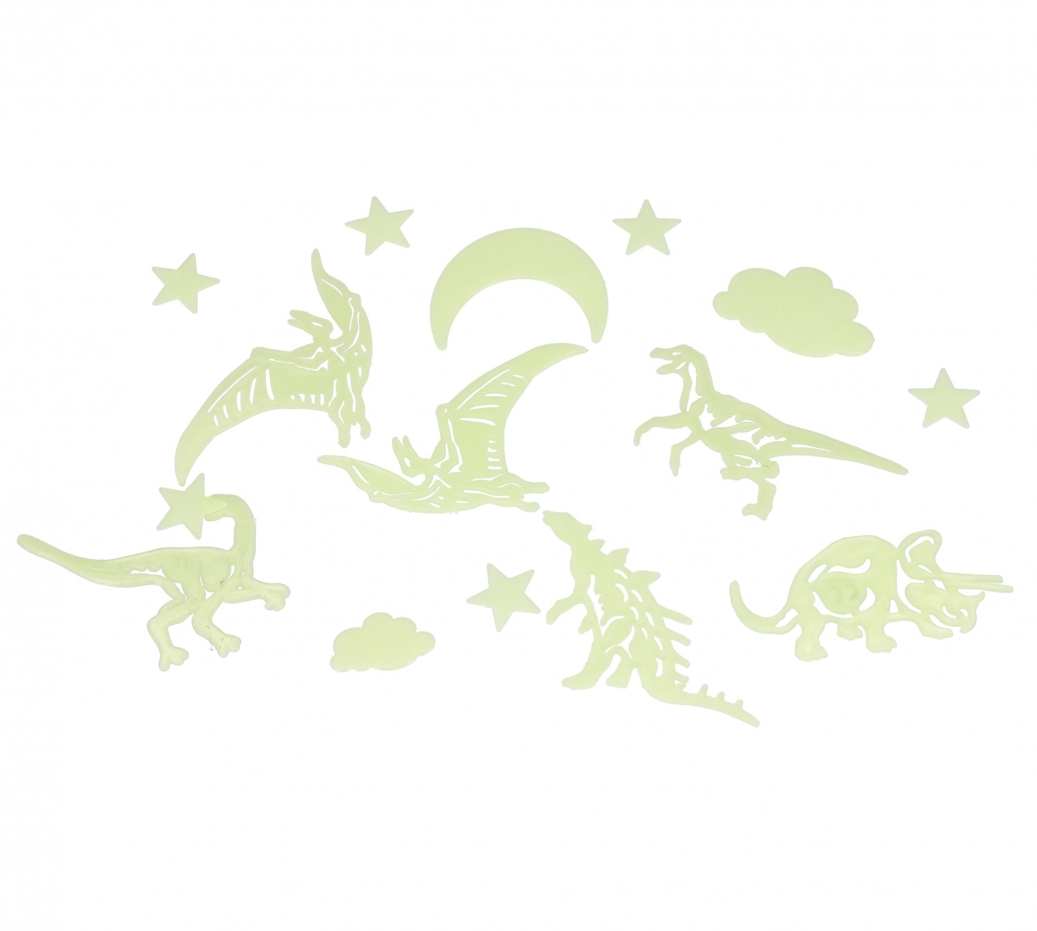 Decora la cameretta con divertenti decorazioni: i dinosauri adesivi luminosi faranno felici i piccoli appassionati di preistoria. Il set comprende 16 pezzi che, dopo essere stati esposti alla luce, brillano delicatamente al buio. Applicazione semplice su pareti o mobili e uso sicuro per bambini dai 3 anni in su.