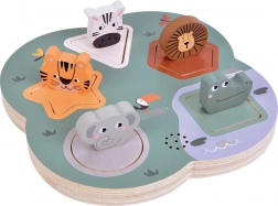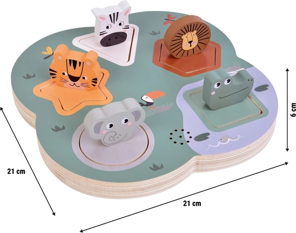 Scopri un apprendimento divertente con questo puzzle 3D in legno SAFARI, che emette suoni realistici degli animali quando sollevi i pezzi. Cinque simpatici amici – leone, tigre, elefante, zebra e coccodrillo – aiutano i bambini a sviluppare motricità fine, coordinazione mano-occhio e riconoscimento di forme e animali. Realizzato in legno certificato FSC al 100%, sicuro per le piccole mani. 2× AAA non incluse.
