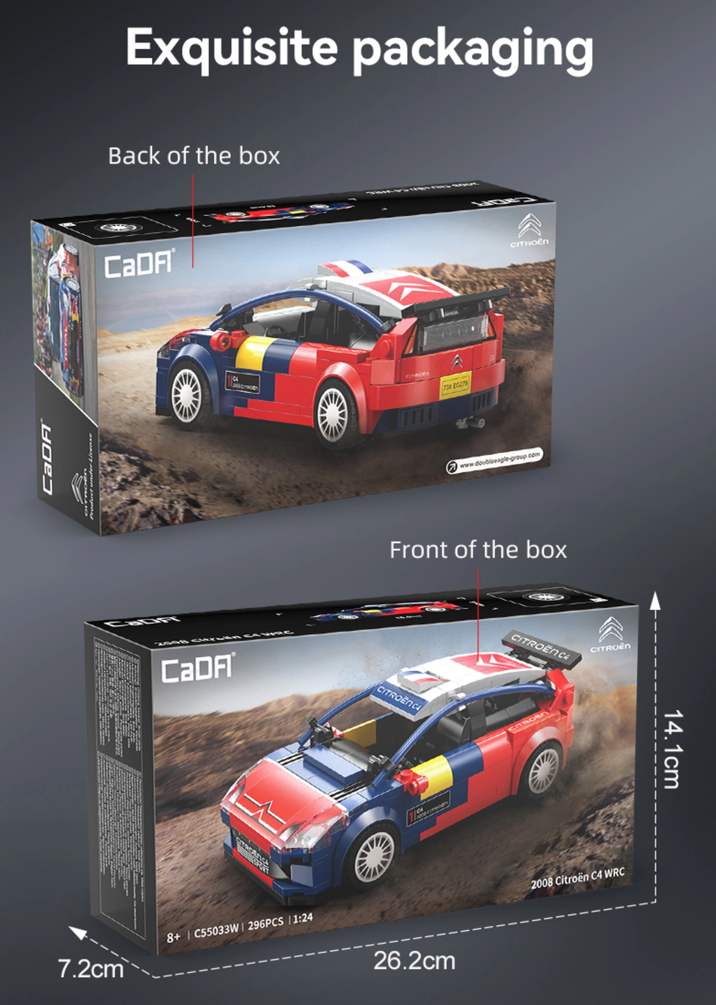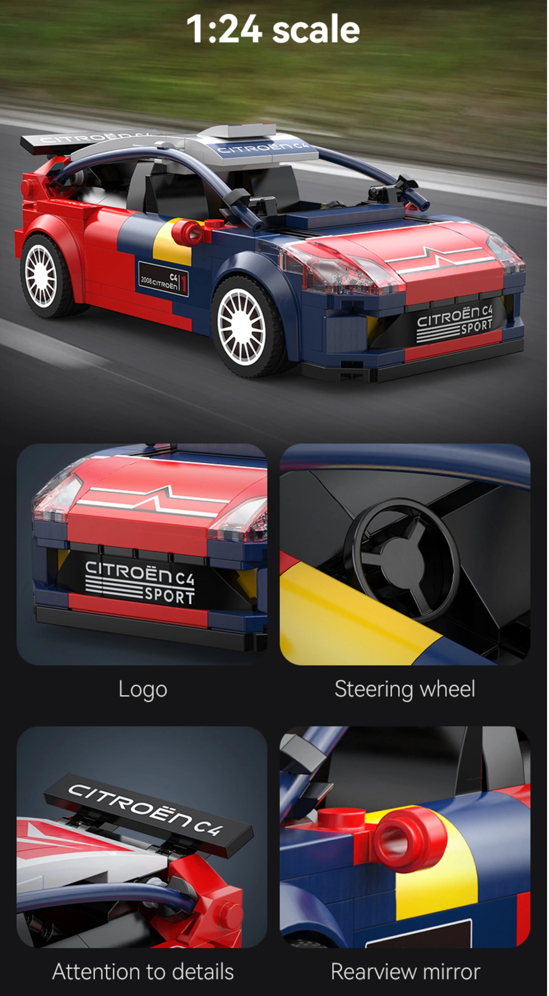 Costruisci l’iconica auto da rally CITROËN C4 WRC in scala 1:24 con il set CaDA da 296 pezzi. Il modello offre ricchi dettagli realistici, scorrimento fluido su 4 ruote e una carrozzeria blu‑rossa accattivante. Perfetto come regalo, pezzo da collezione e per una costruzione divertente in compagnia.