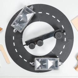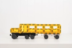 Due telai con ruote e una base per treno trasformano le tessere in modelli su ruote. I bambini possono assemblare un camion, un trenino o un convoglio con vagoni, sviluppando fantasia e coordinazione.