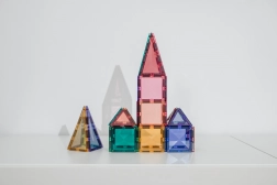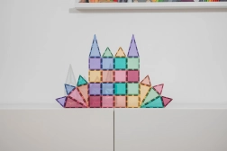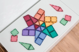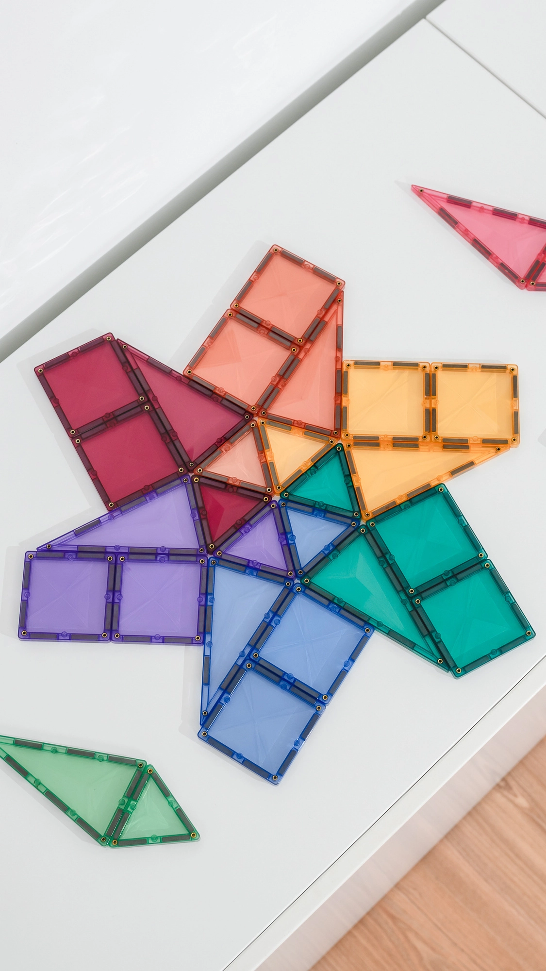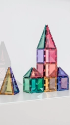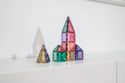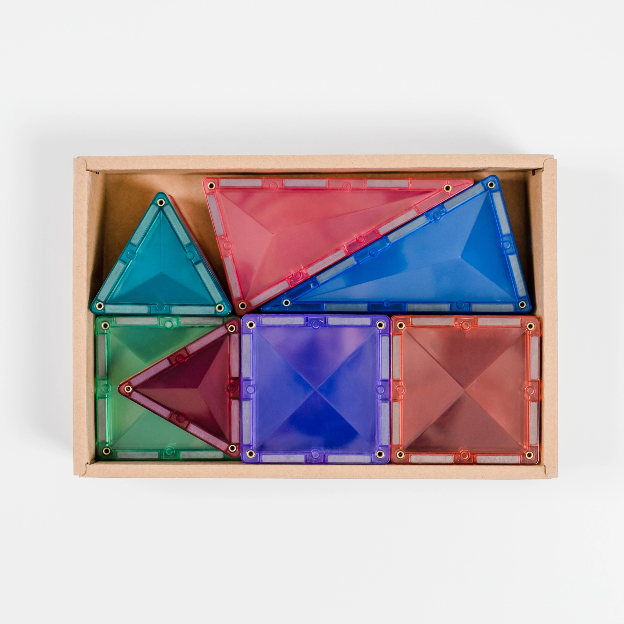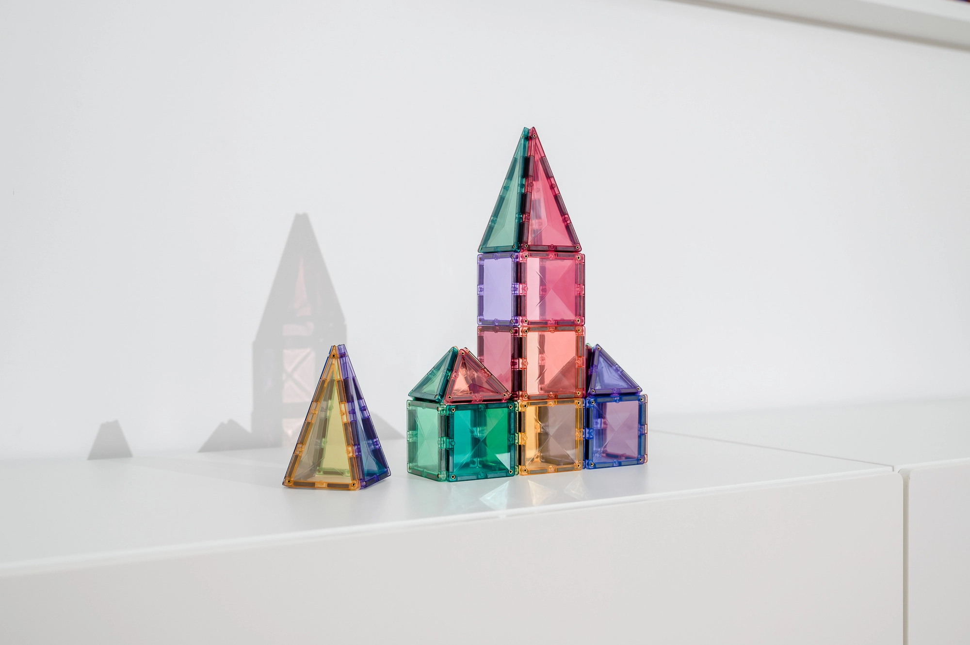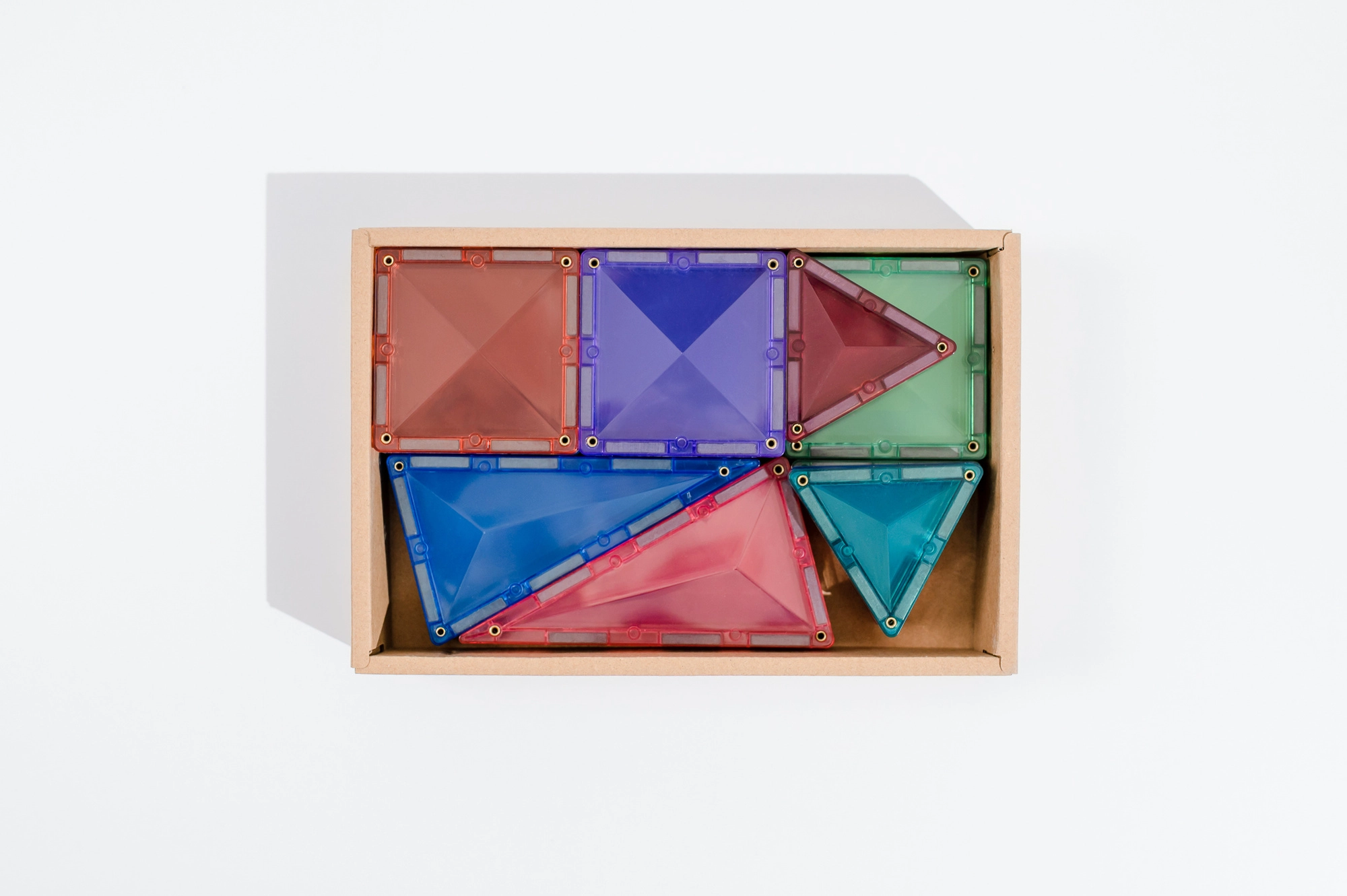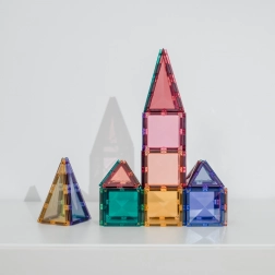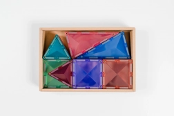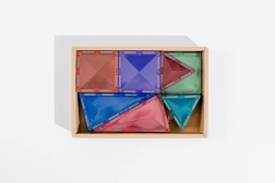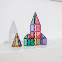 Il set include 16 quadrati piccoli, 8 triangoli equilateri e 8 triangoli isosceli più un’opuscolo illustrato con idee. Grazie alla compatibilità con gli altri set CONNETIX, potrai espandere le costruzioni all’infinito. I colori trasparenti lasciano filtrare magnificamente la luce e stimolano il gioco sensoriale.