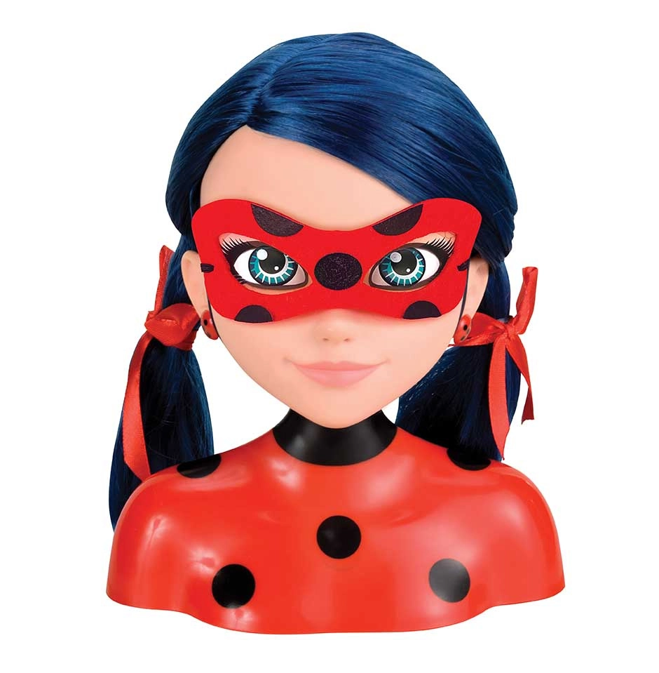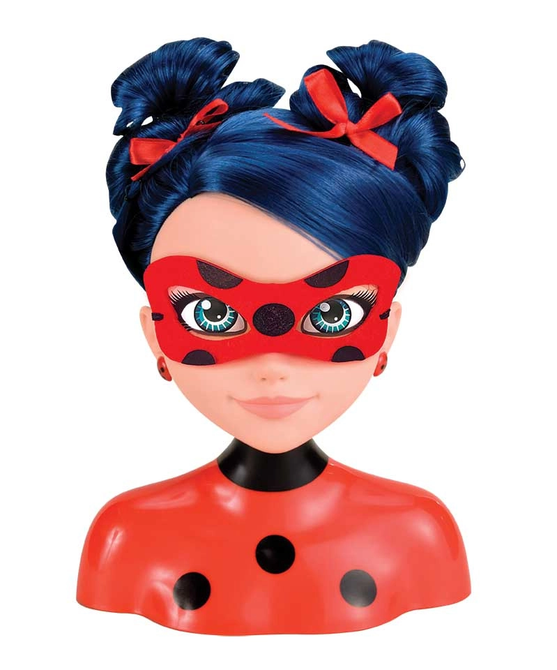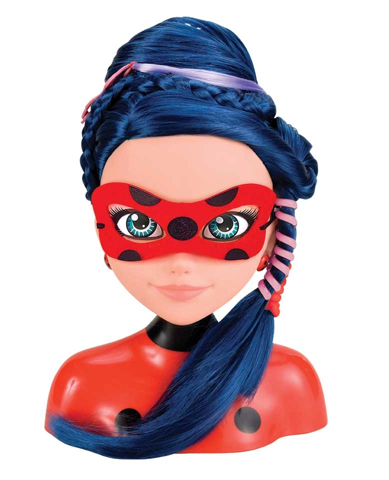 La testa per acconciature di Marinette ispirata alla serie MIRACULOUS ha lineamenti delicati, occhi blu espressivi e lunghi, morbidi capelli blu scuro facili da modellare. Il supporto a busto stabile facilita la pettinatura e l’esposizione nella cameretta.