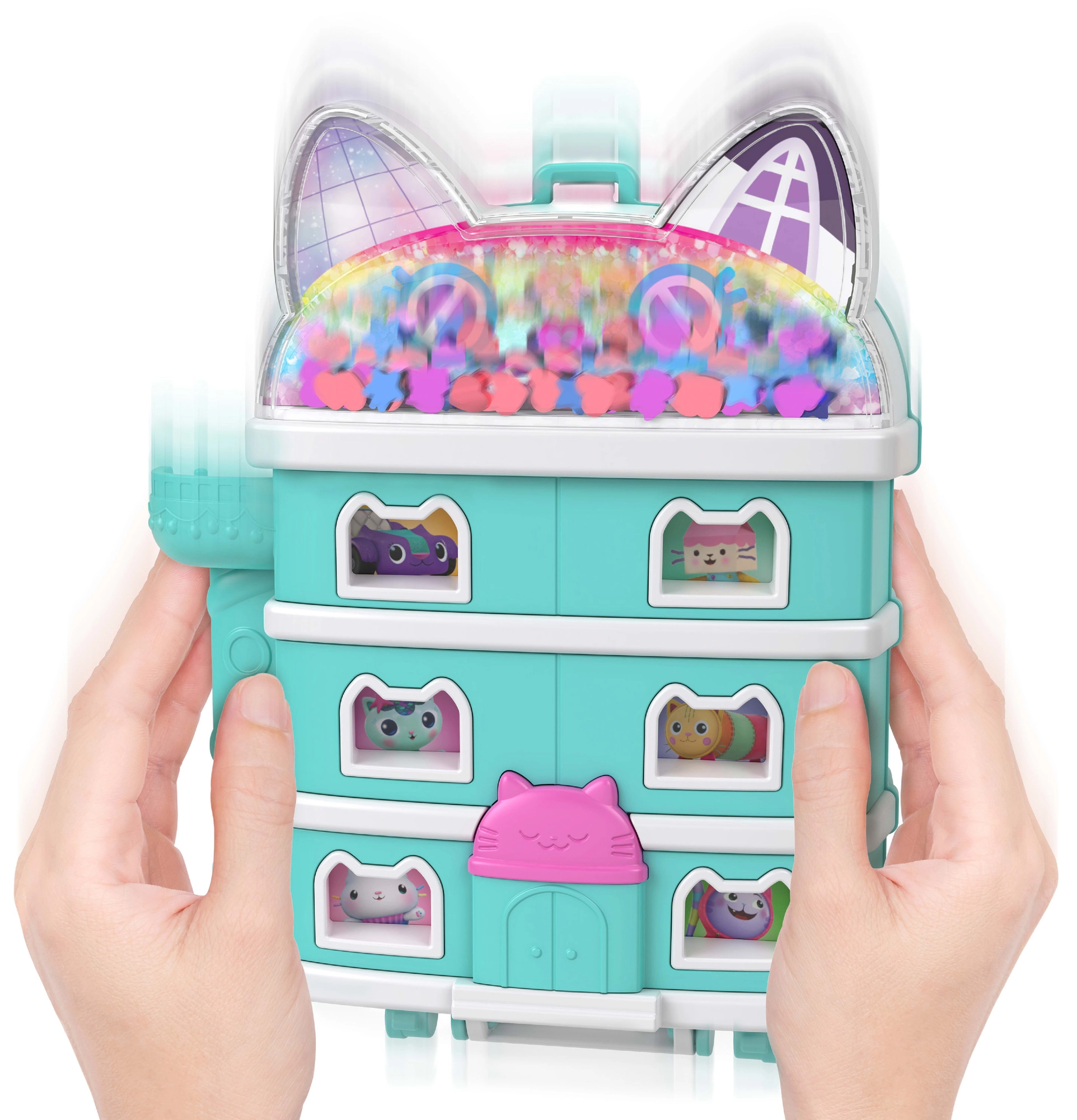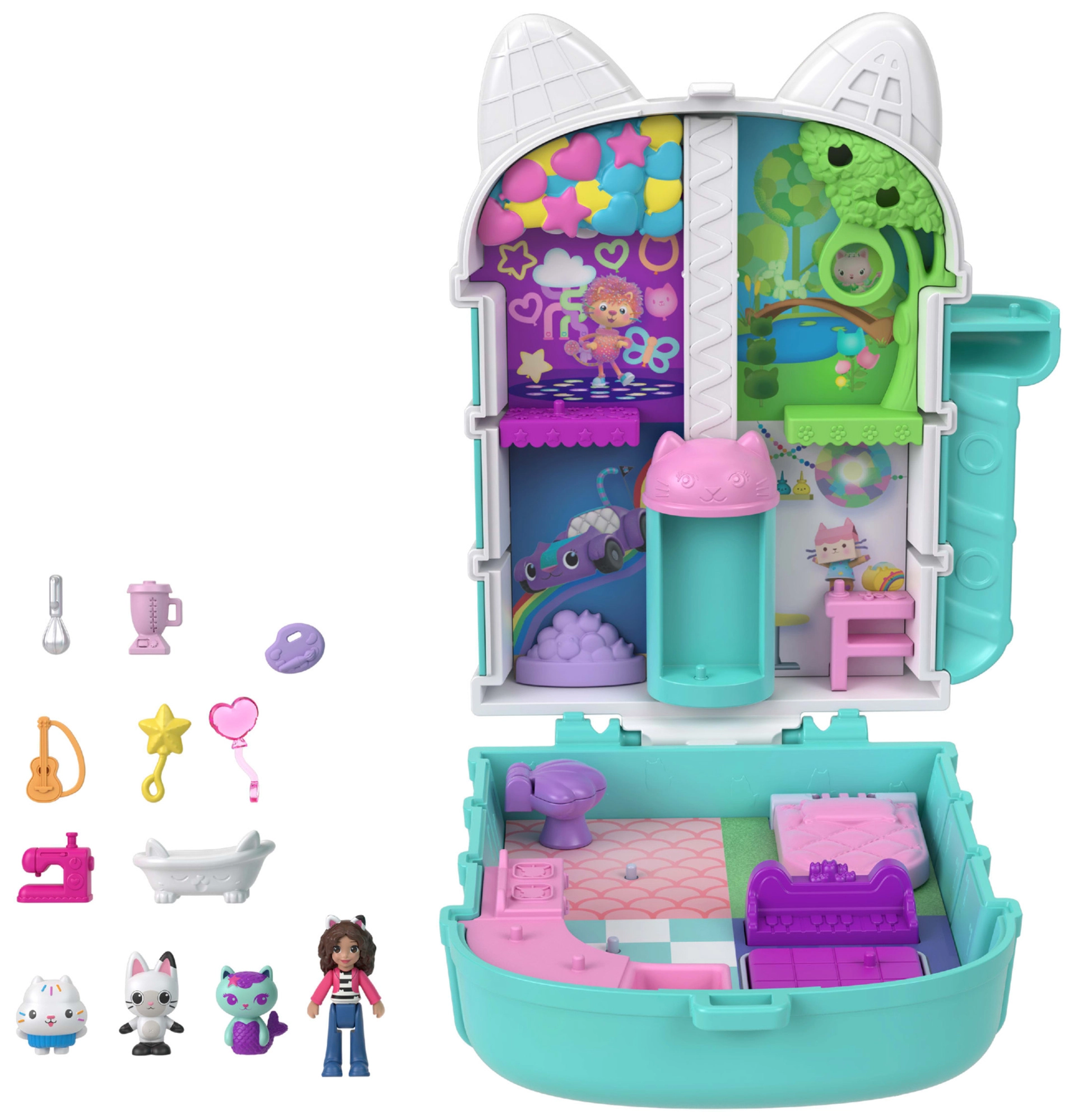 La casetta compatta dei gattini Polly Pocket offre ai bambini un ricco mondo di fantasia in un piccolo astuccio portatile. Una volta aperta, rivela interni a più piani con camerette a tema, una cupola scintillante e parti mobili che invitano a creare storie ispirate a GABBY’S DOLLHOUSE.