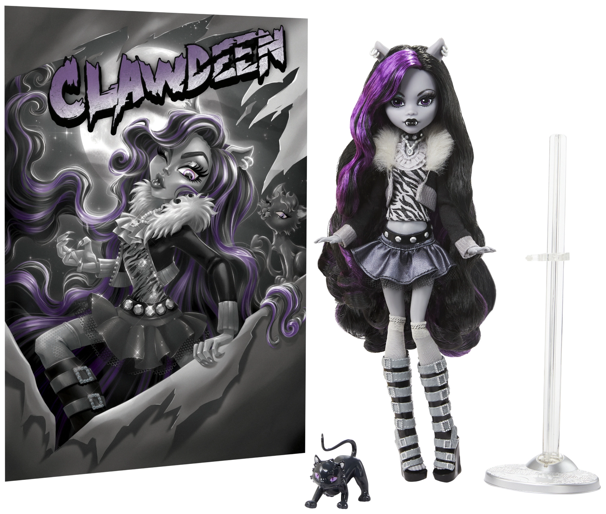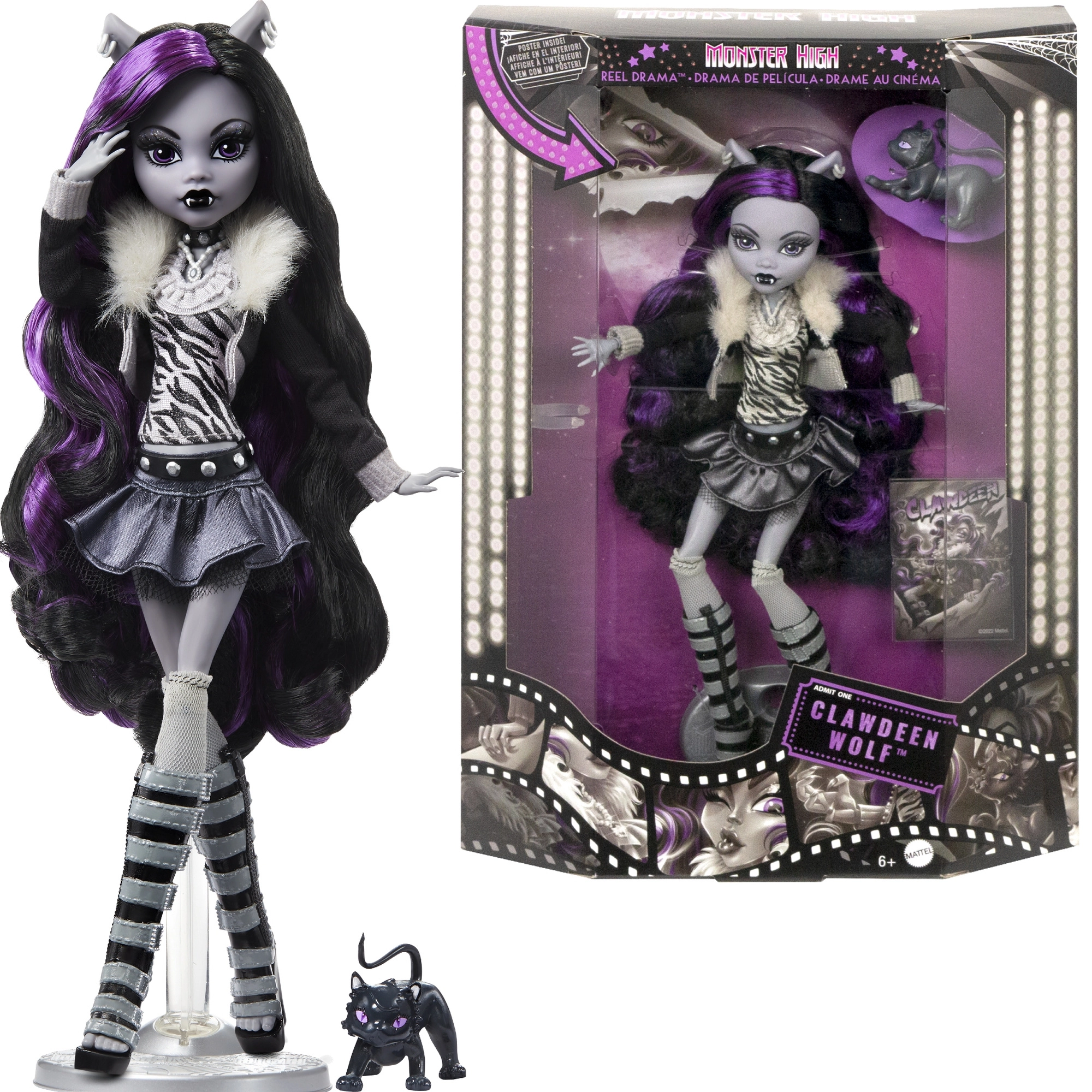 Elegante bambola da collezione MONSTER HIGH Clawdeen Wolf della serie Reel Drama, un omaggio ai film horror in bianco e nero e allo stile iconico della saga. Misura circa 26 cm, ha un corpo completamente snodato per pose creative e vistosi capelli nero‑viola. Non mancano un outfit rétro elegante, lo stand e un tenero animaletto, ideale per giocare e per l’esposizione.