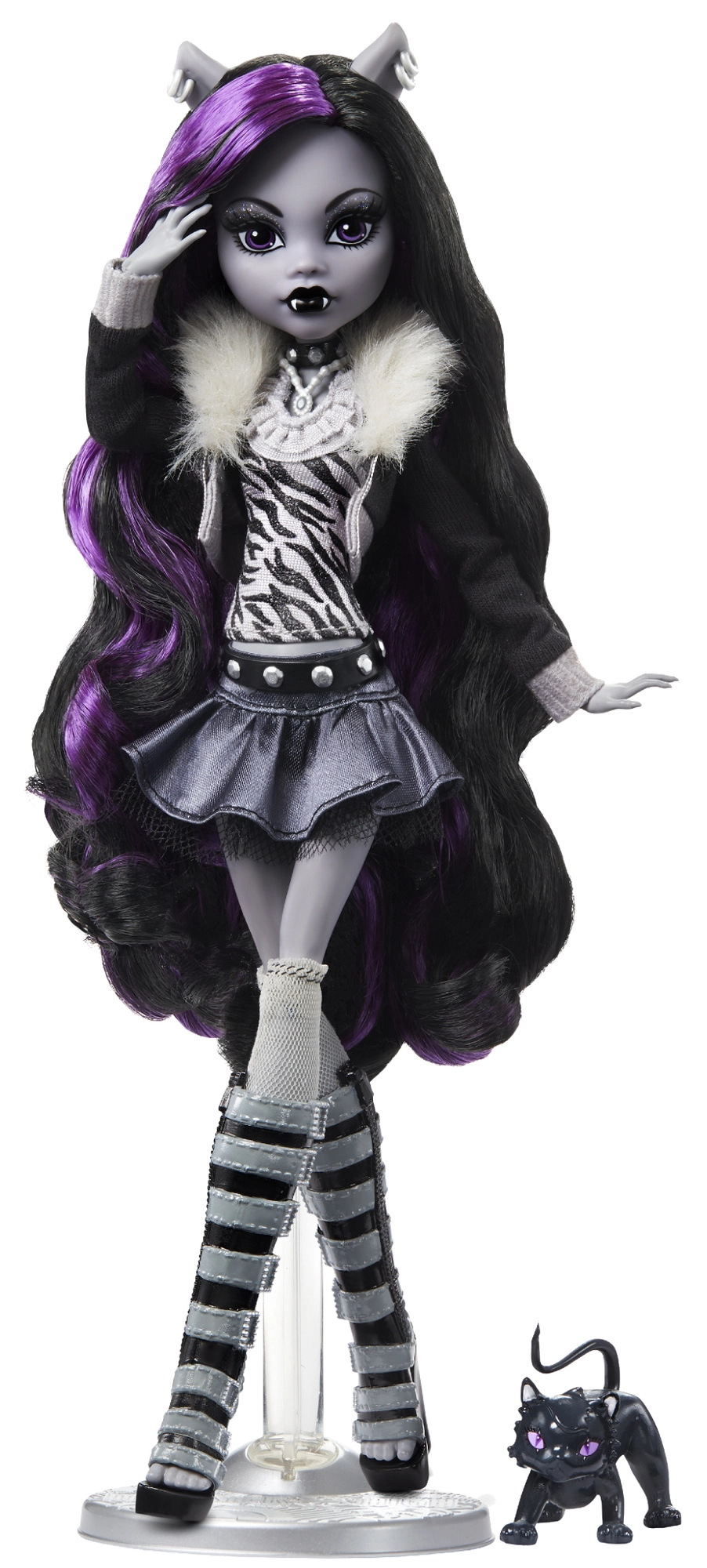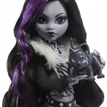 Scopri il design unico della linea Reel Drama: Clawdeen Wolf brilla in una stilizzazione monocromatica con contrastanti accenti viola. L’abbigliamento dettagliato con morbido giacchino “peloso”, gonna svasata e sandali con zeppa sottolinea il suo carattere grintoso. Grazie alle articolazioni puoi metterla facilmente in pose iconiche per vetrina e foto.