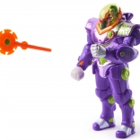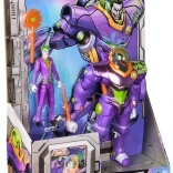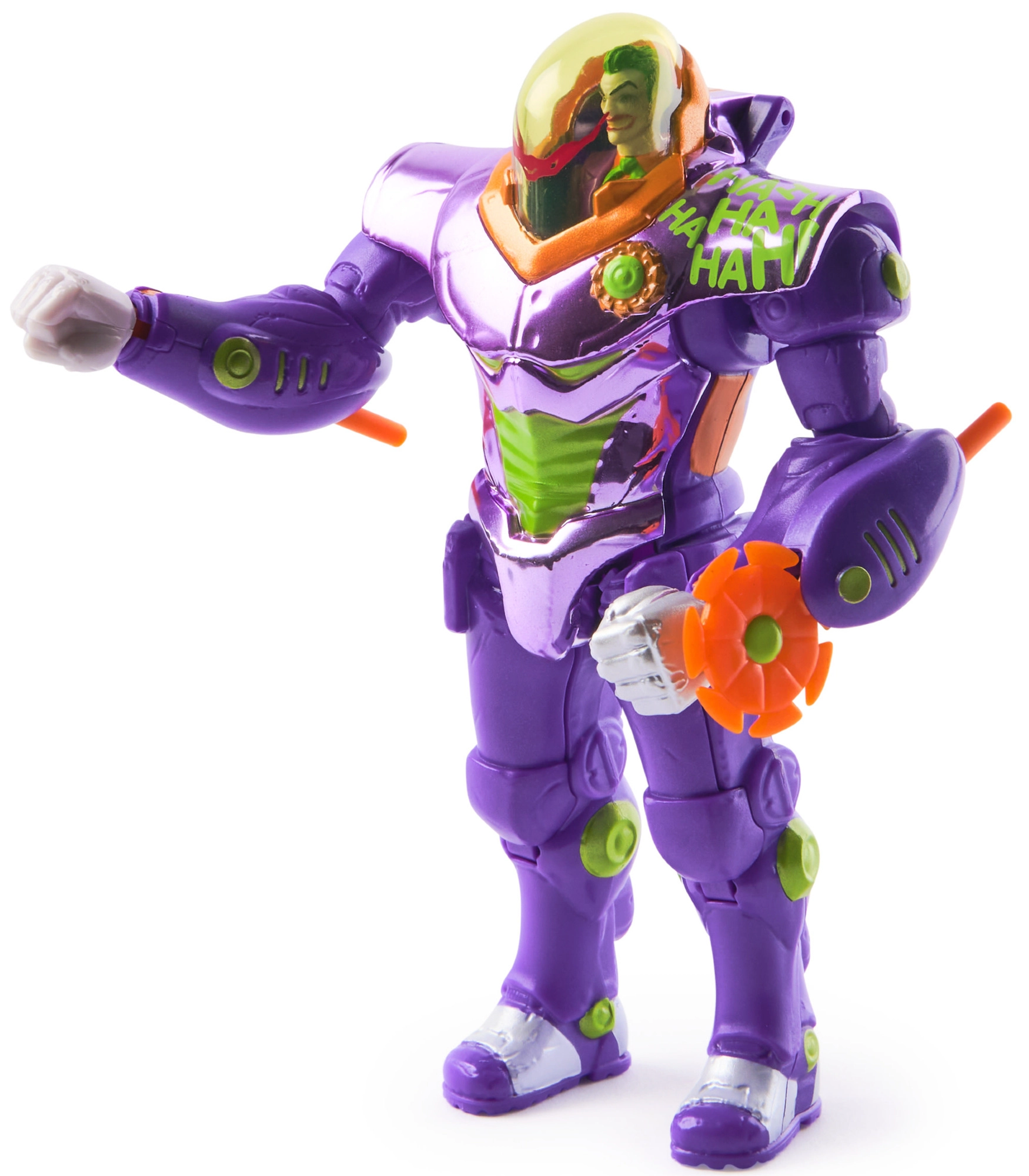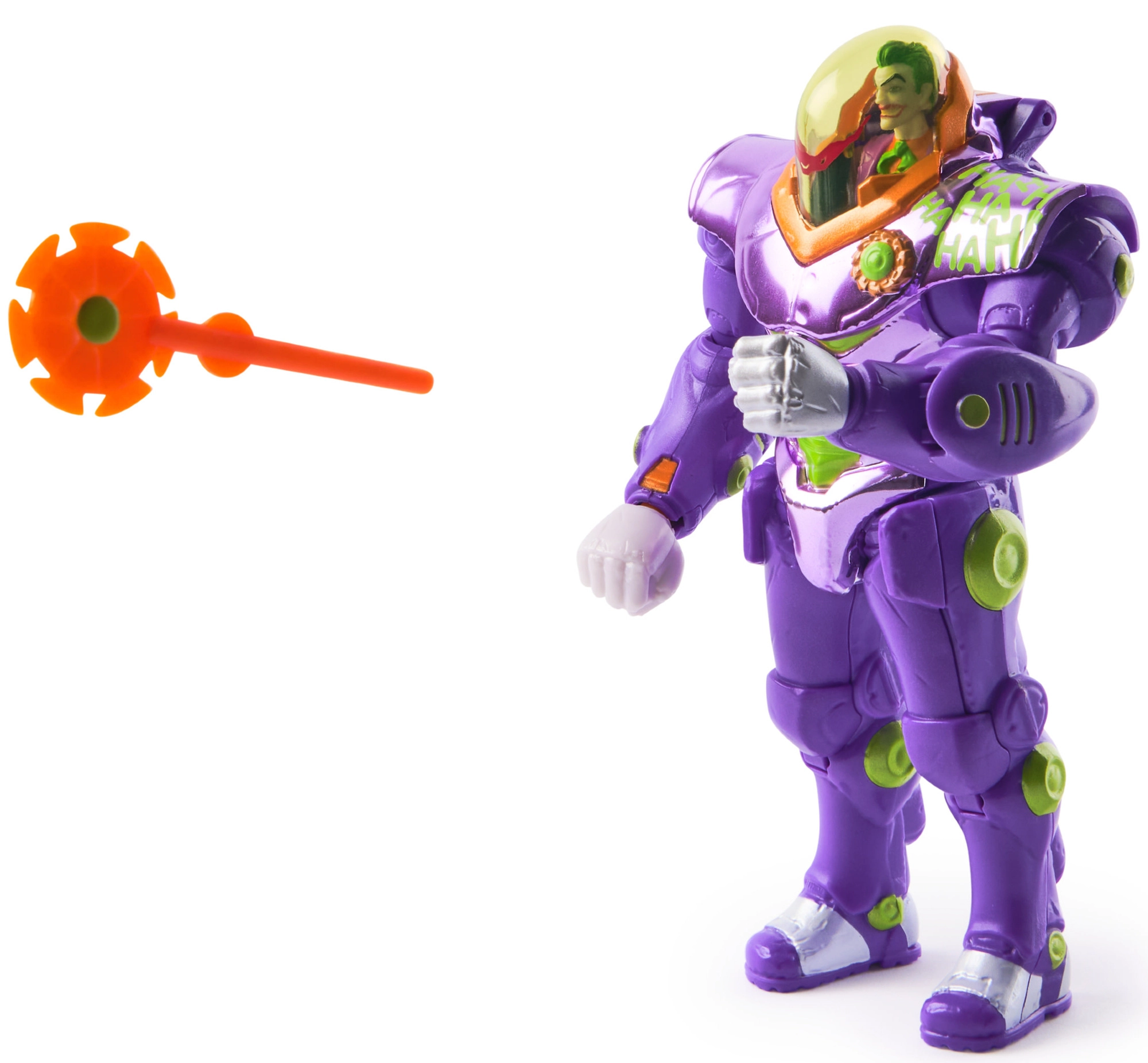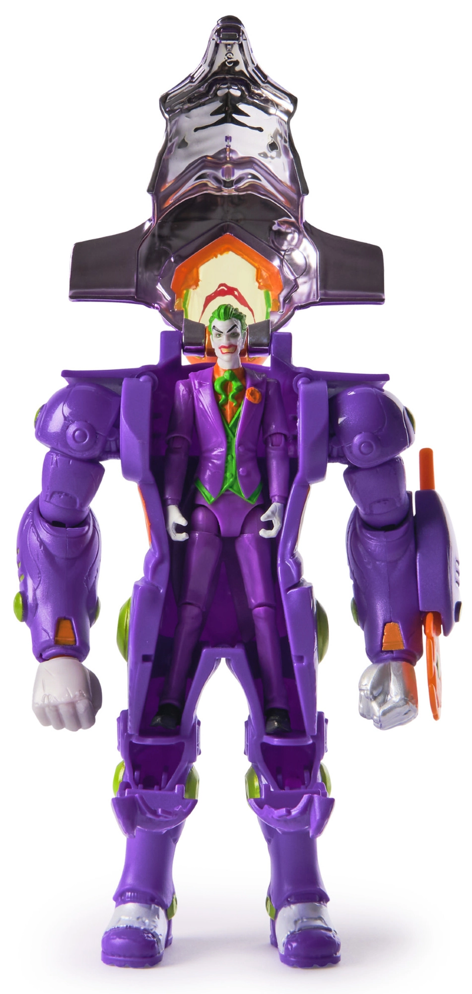 La grande armatura viola con visiera trasparente può ospitare la figura da 10 cm di THE JOKER. La parte superiore apribile consente di sistemare velocemente la figura e prepararla all’azione.