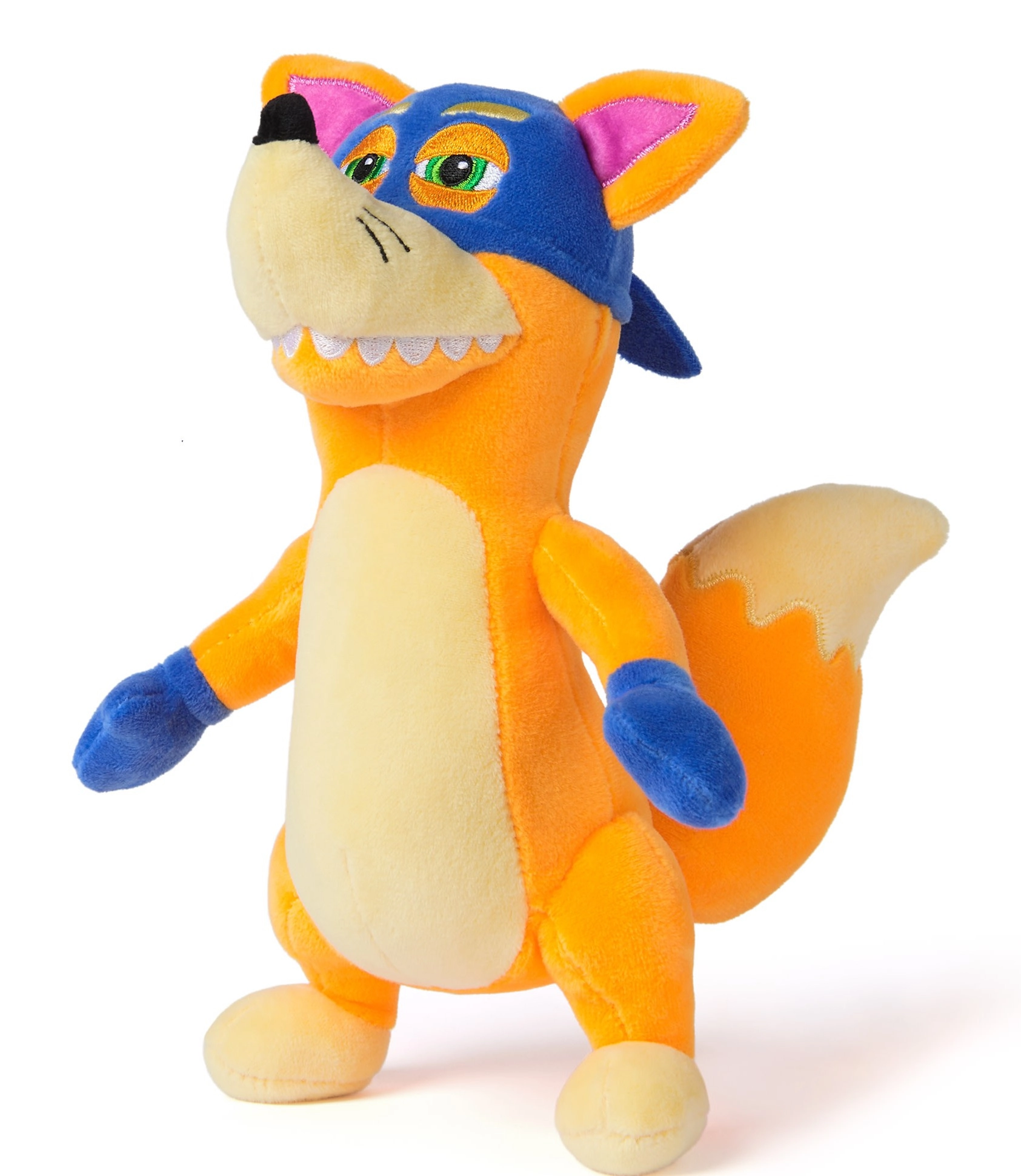 Porta a casa la volpe Swiper, il famoso “monello” della serie DORA L’ESPLORATRICE. La figure in peluche con l’iconica maschera e guanti blu ha una superficie soffice, occhi e dentini ricamati ed è progettata per coccole quotidiane.