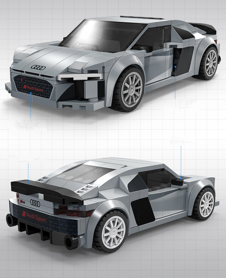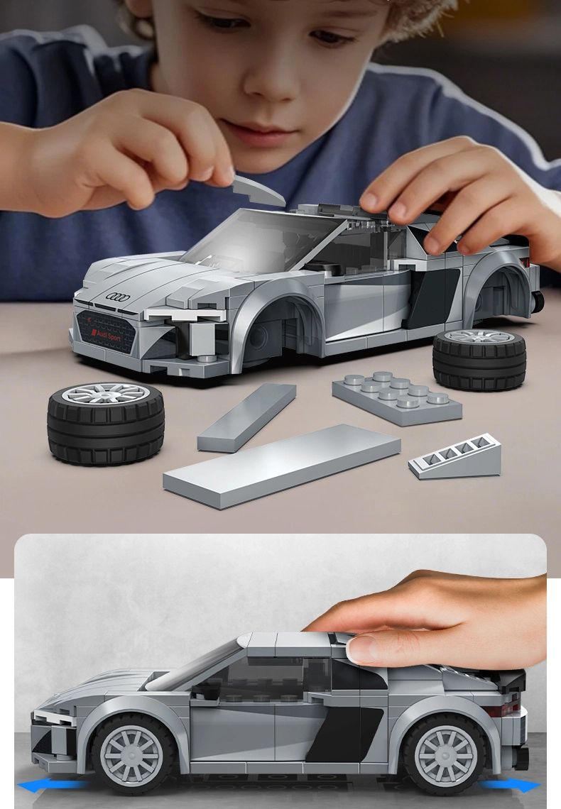 Proporzioni fedeli e linee affilate dell’R8 conferiscono autenticità grazie alla licenza del marchio AUDI. Dettagli come la griglia anteriore, le prese d’aria e i fari risultano realistici.