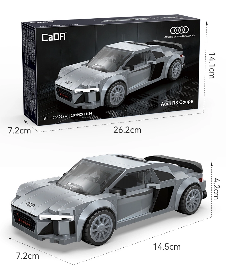 Questo set con licenza CaDA riproduce fedelmente le linee aggressive dell’auto sportiva AUDI R8 Coupé (2019). Grazie ai pezzi di qualità e alle stampe precise senza adesivi spiccano il frontale realistico con griglia nera, le doppie prese d’aria e i profili laterali puliti. Una volta assemblato, il modello misura circa 14,5 × 7,2 × 4,2 cm e risalta perfettamente su una mensola o sulla scrivania.