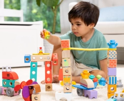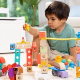 Blocchi illustrati con fori e connettori invitano a ordinare, infilare e abbinare. I bambini esercitano il riconoscimento di forme e motivi, oltre alla motricità fine.