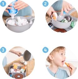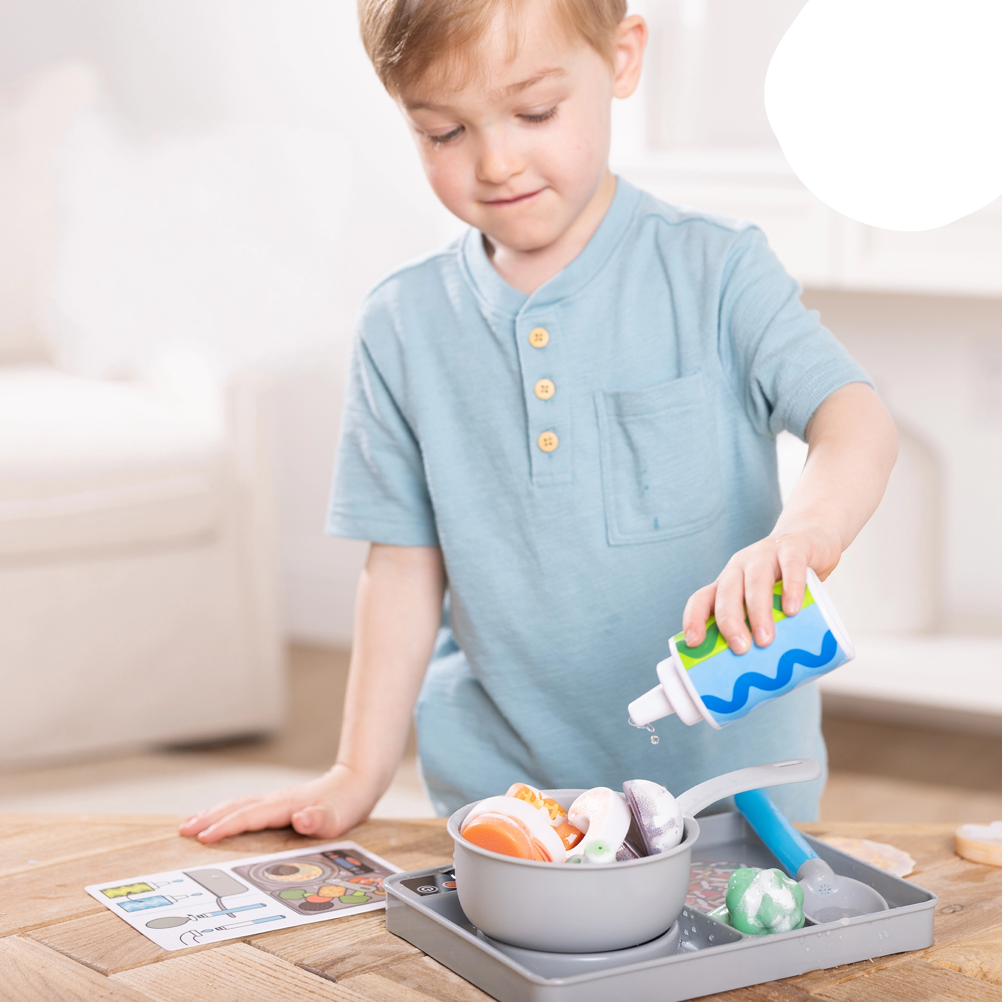 Il set include vassoio con piano cottura, pentola con manico, cucchiaio per mescolare e boccetta contagocce. Non mancano pezzi di alimenti colorati (verdure e proteine), dischi “cibo” bifacciali (ad es. riso, zuppa, spaghetti, mac and cheese) e una scheda attività bifacciale con idee e compiti di gioco.