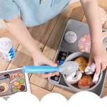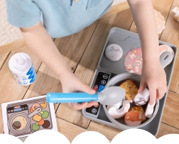 Il vassoio con l’imitazione del piano cottura, la pentola e il cucchiaio per mescolare creano un ambiente realistico per giocare a fare gli chef. I bambini possono mescolare, travasare e servire come in una vera cucina.