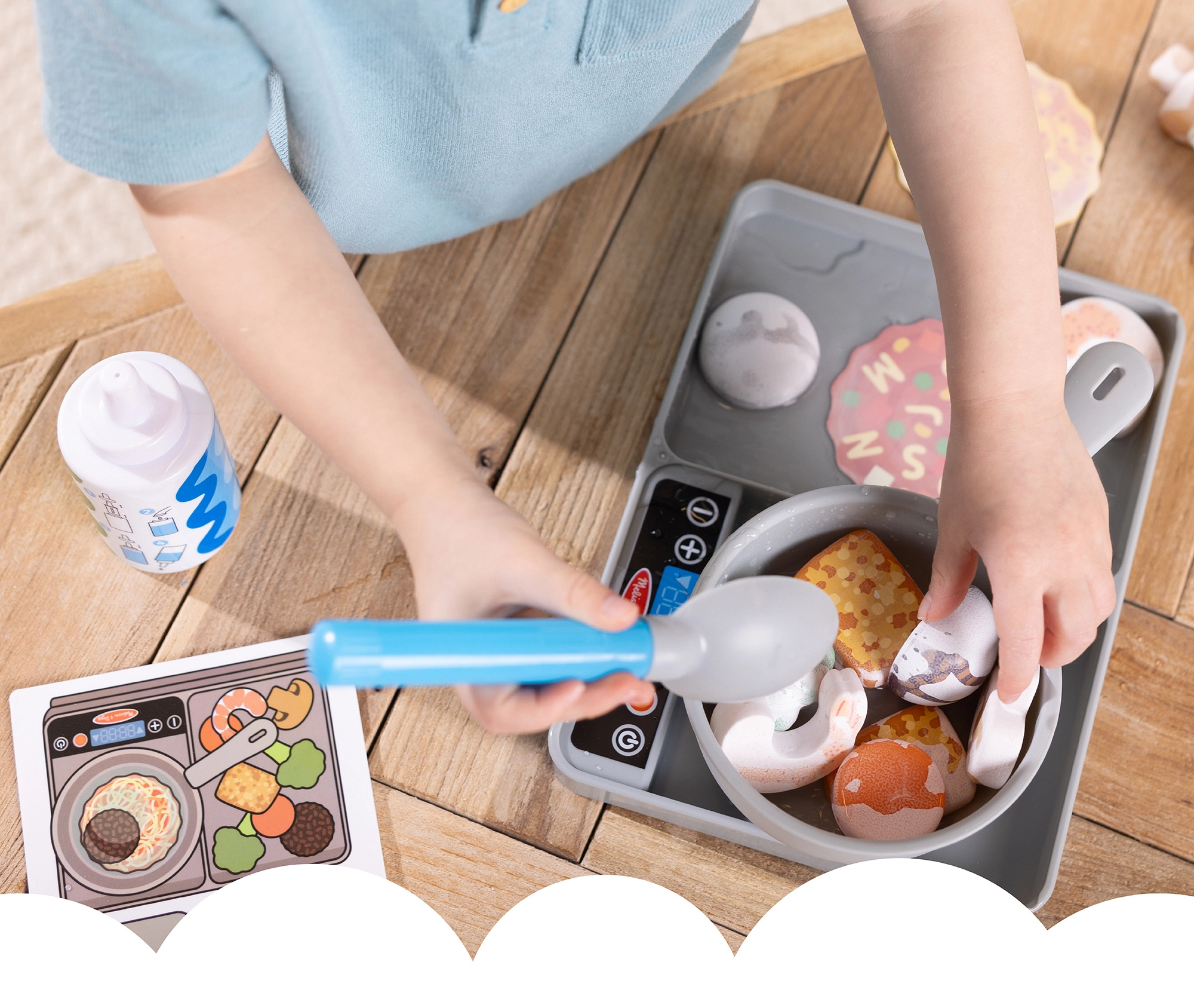 I pezzi di “cibo” passano da “congelato” a “cotto” quando vengono bagnati con l’acqua della boccetta o con il cucchiaio. I bambini scoprono naturalmente la relazione causa-effetto e ricevono un feedback immediato durante il gioco.