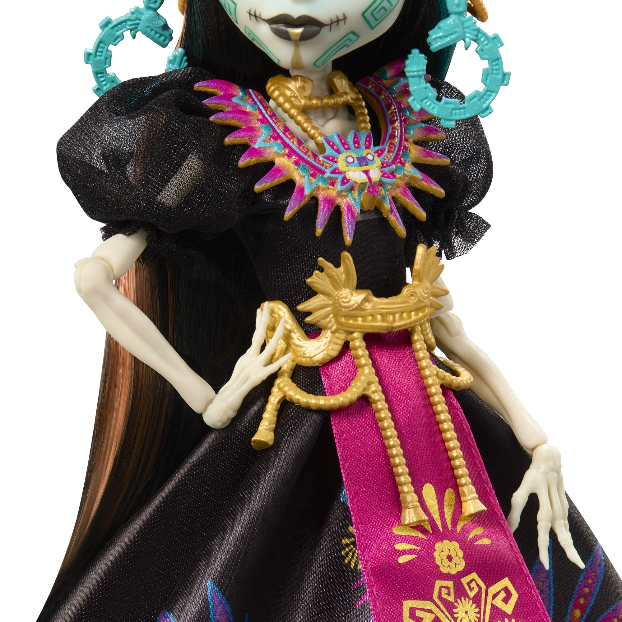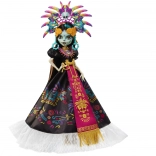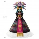 L’edizione da collezione Monster High Skullector rende omaggio alla festività messicana del Día de Muertos. Skelita Calaveras incanta con un lungo abito nero dal finish satinato, stampe colorate e una vistosa fascia magenta con frange dorate. Il copricapo piumato dominante, i gioielli importanti e il face paint dettagliato la rendono un pezzo d’eccezione per gli appassionati di design e cultura.