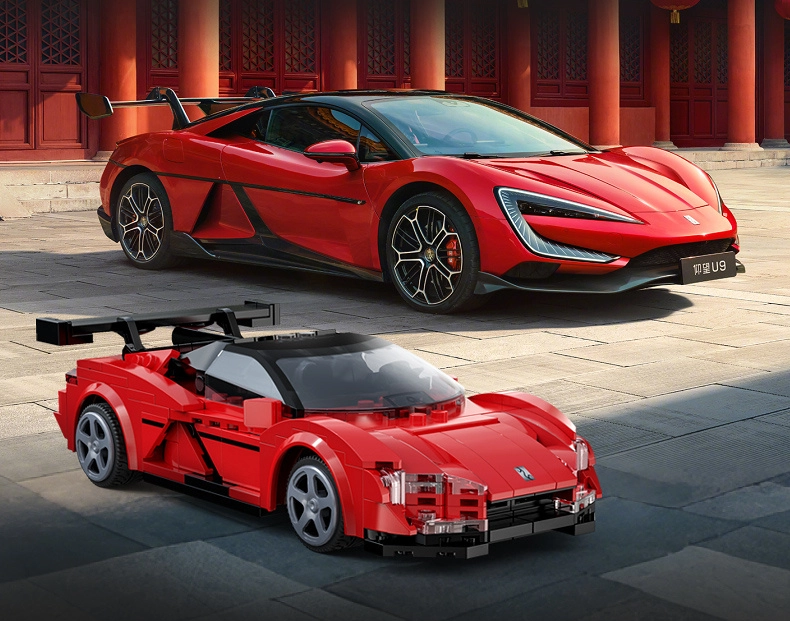 La carrozzeria rossa con stampa, i fari trasparenti e il grande alettone posteriore riproducono fedelmente l’aspetto della sportiva YANGWANG U9.