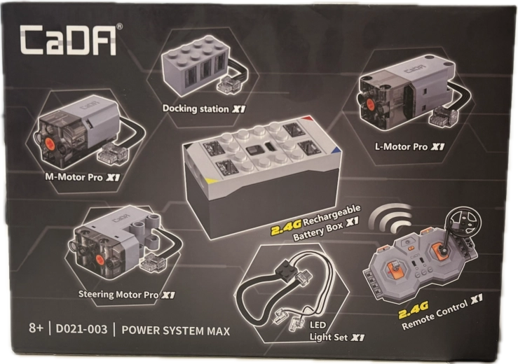 Amplia i tuoi set CADA con trazione realistica e illuminazione grazie al set Power System Max. Ottieni controllo preciso a 2,4 GHz senza interferenze, lunga autonomia della batteria e compatibilità con molti modelli in formato standard. Nella confezione trovi tre potenti motori, luci LED, telecomando e cavo di ricarica USB – tutto ciò che ti serve per portare il divertimento a un nuovo livello.
