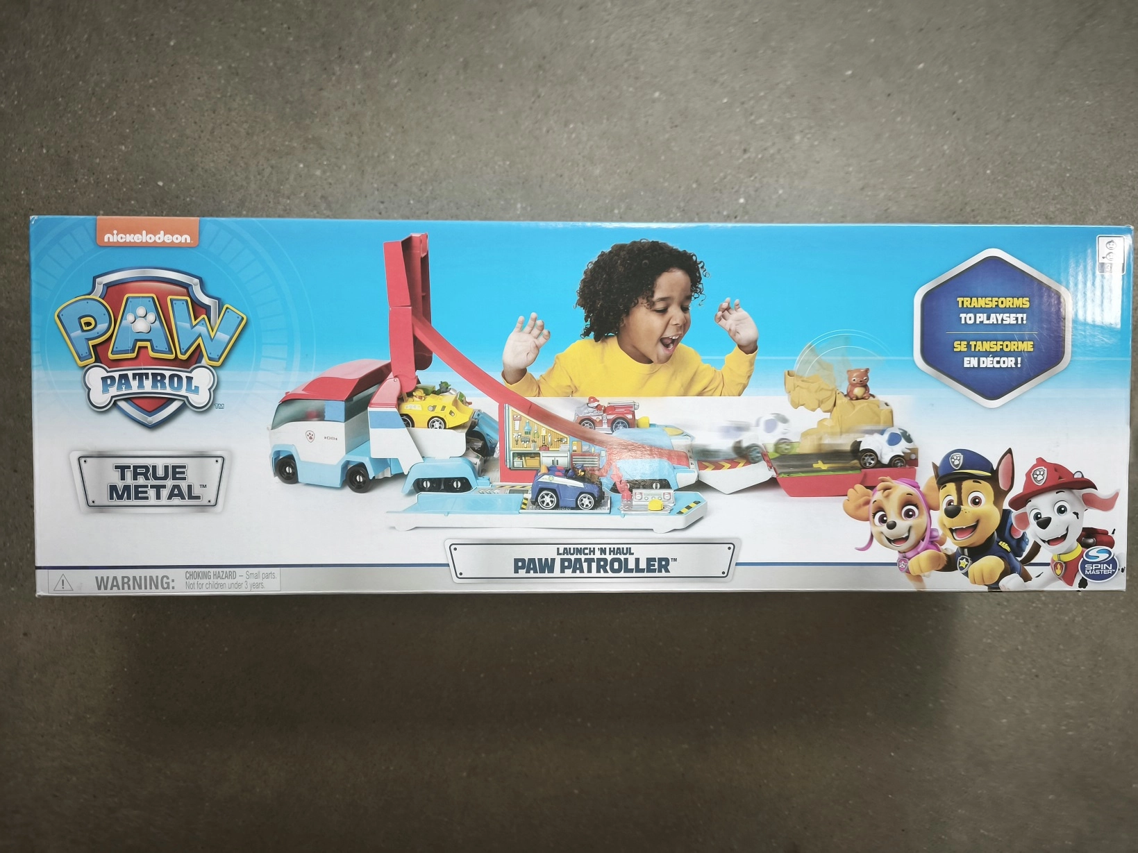 Set per bambini ispirato alla serie PAW PATROL del marchio Spin Master che offre un trasportatore 2 in 1 trasformabile nei colori bianco-blu-rosso. Il rimorchio, una volta aperto, si trasforma in una grande lanciatrice per macchinine, permette di svolgere diverse missioni di salvataggio e contiene fino a 7 veicoli in metallo True Metal (venduti separatamente). OUTLET – INCOMPLETO: manca il Robo-cane.