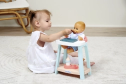 Seggiolone alto e stabile con piattino divisorio, tazzina e posate consente ai bambini di “nutrire” la bambola in modo realistico. Bordi arrotondati e struttura solida favoriscono un gioco sicuro.