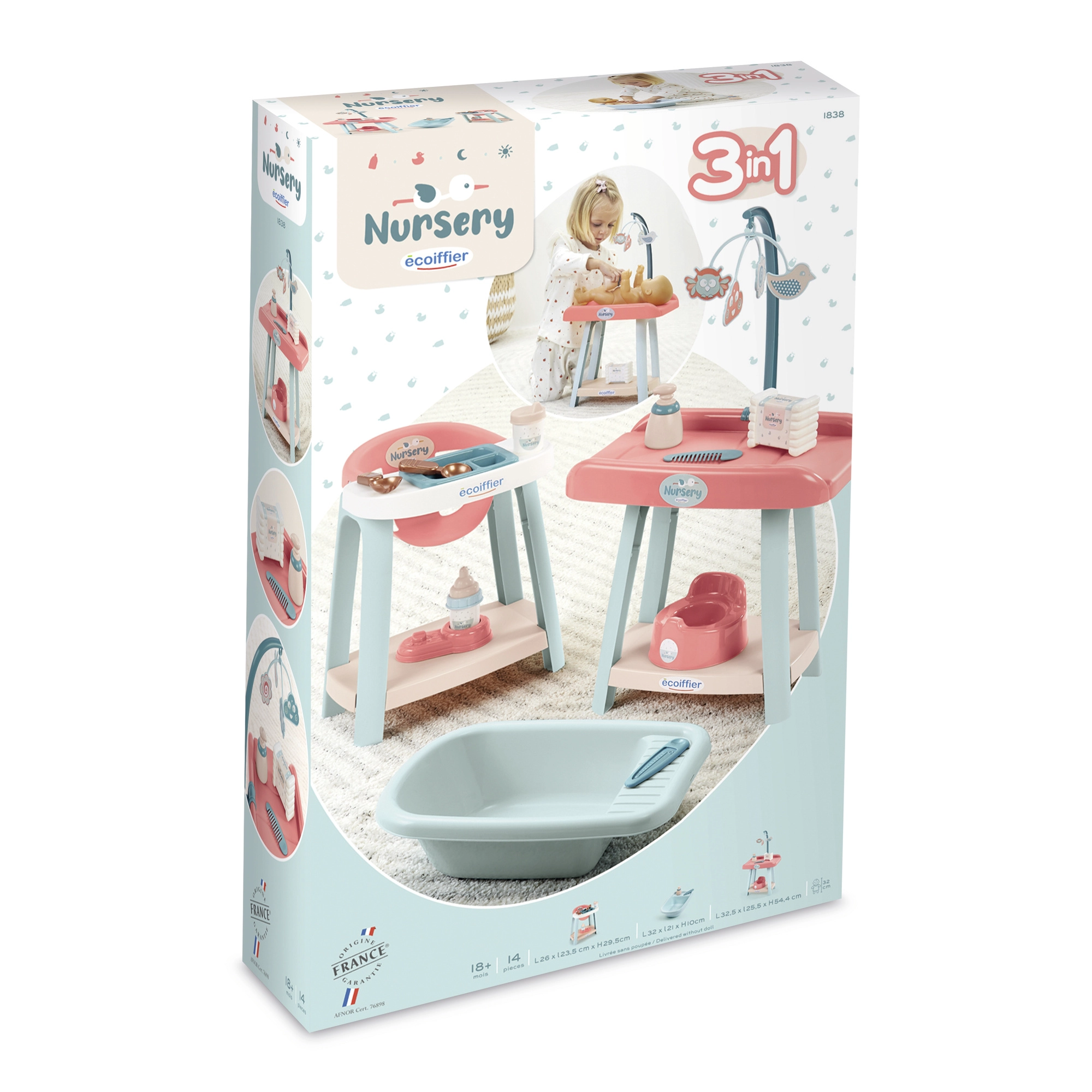 Ecoiffier Nursery 3 in 1 è un set versatile per la cura delle bambole che offre tutto: dall’alimentazione al cambio fino al bagnetto. Grazie a tre aree di gioco e a una ricca dotazione, i bambini possono imitare la cura quotidiana del bebè e creare le proprie storie. I colori pastello e le forme arrotondate garantiscono un aspetto gradevole e un uso sicuro.