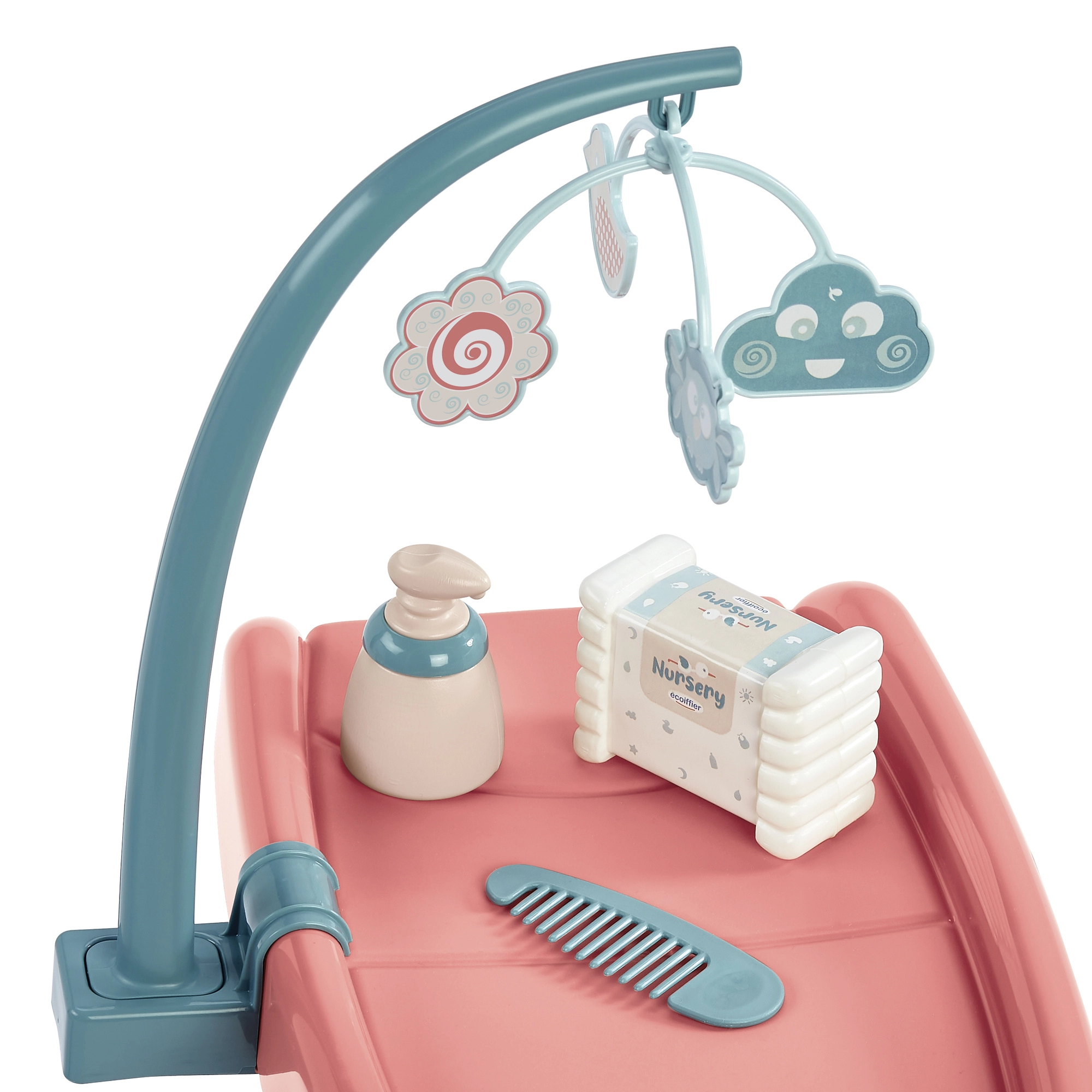 Il set include un piano fasciatoio con scomparti, una compatta vaschetta azzurro chiaro con vasino e un seggiolone alto e stabile con vassoio rimovibile per l’alimentazione. Sono inclusi anche accessori come biberon, ciotole e posate, pettine e “pannolini”. Tutto adatto a bambole di circa 32 cm.