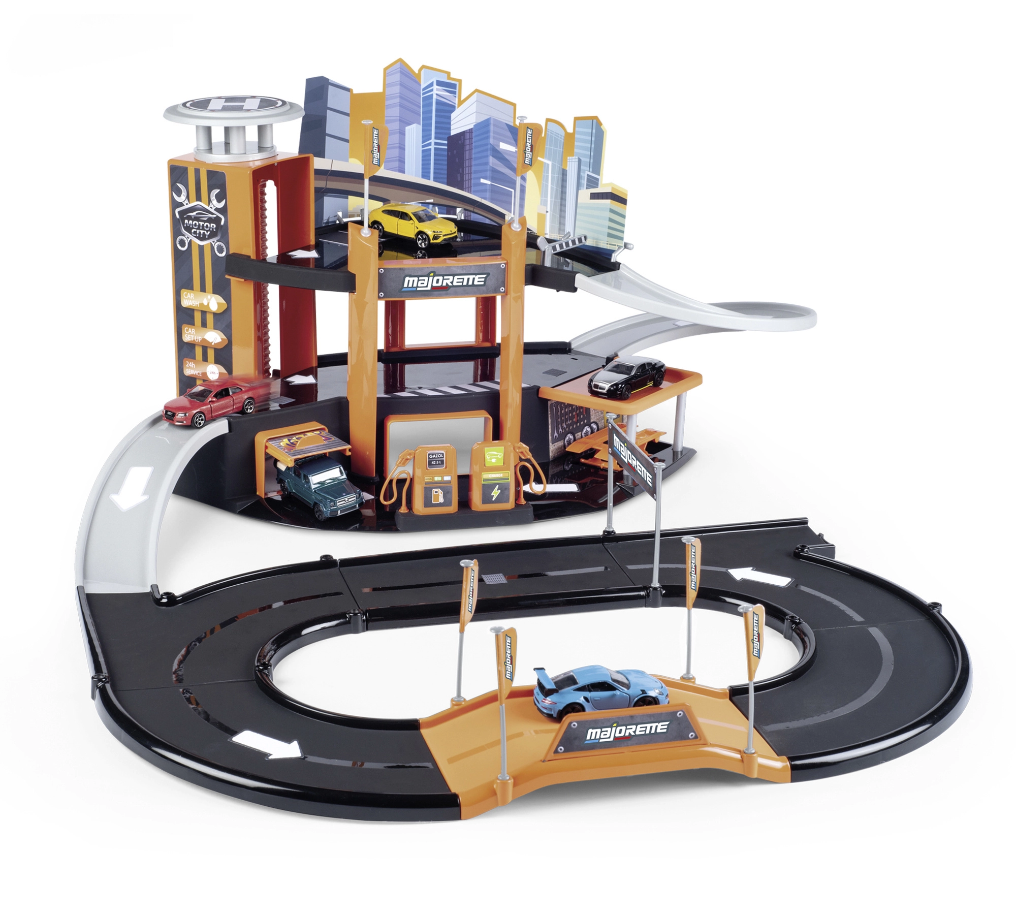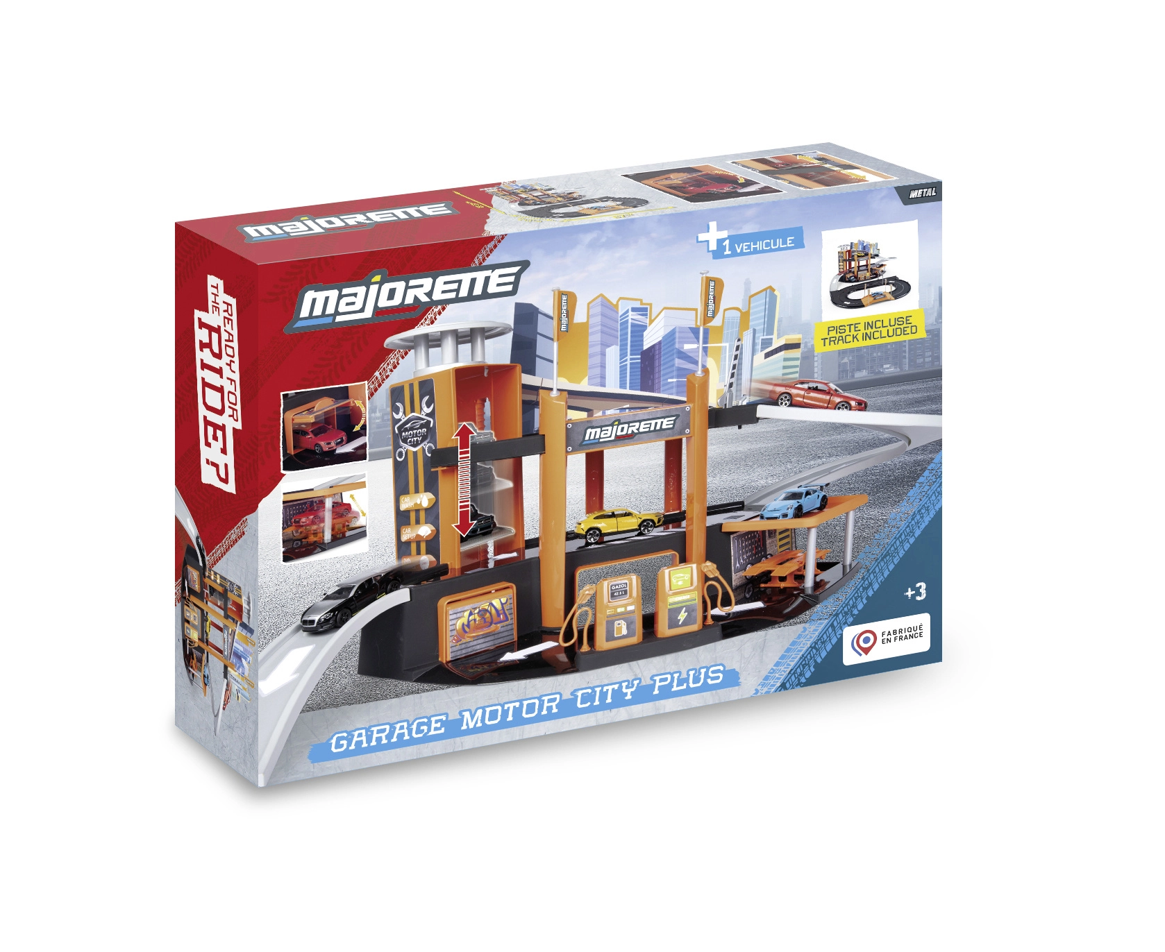 Scopri il massimo del divertimento con il set da garage Motor City Plus del marchio MAJORETTE – parcheggio a 3 piani con lunga pista di discesa, loop, ascensore, officina e stazione di servizio con possibilità di “ricarica” anche per auto elettriche. Incluso anche un modellino di auto cittadina per iniziare a giocare subito.