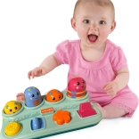 Questo giocattolo interattivo pop-up con una solida base turchese è progettato per le piccole mani. Quattro figurine colorate “saltano fuori” premendo un pulsante, spostando il cursore, ruotando la rotella o ribaltando la leva. I bambini allenano in modo naturale presa, destrezza e coordinazione, mentre scoprono la magia della causa ed effetto.