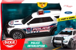 L'auto della polizia per bambini FORD INTERCEPTOR del marchio Dickie Toys offre un divertimento d'azione realistico con effetti luminosi e sonori. Carrozzeria bianca con dettagli evidenti, grandi ruote in plastica per la marcia in avanti e lampeggianti insieme alla sirena ricreano un'atmosfera autentica di intervento della polizia.