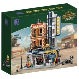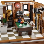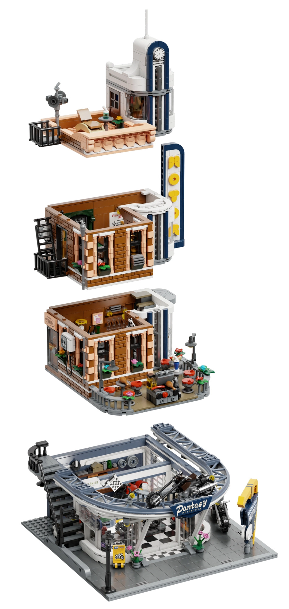 Ristorante d’angolo con negozio di motociclette, minifigure e accessori stradali offre tanti scenari per il gioco e per il display.